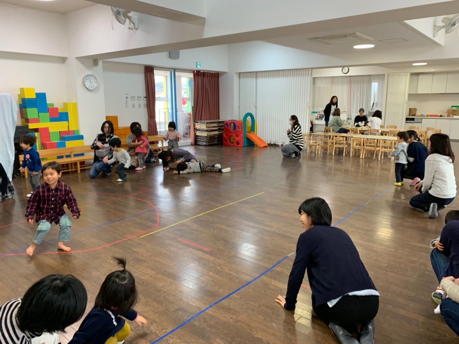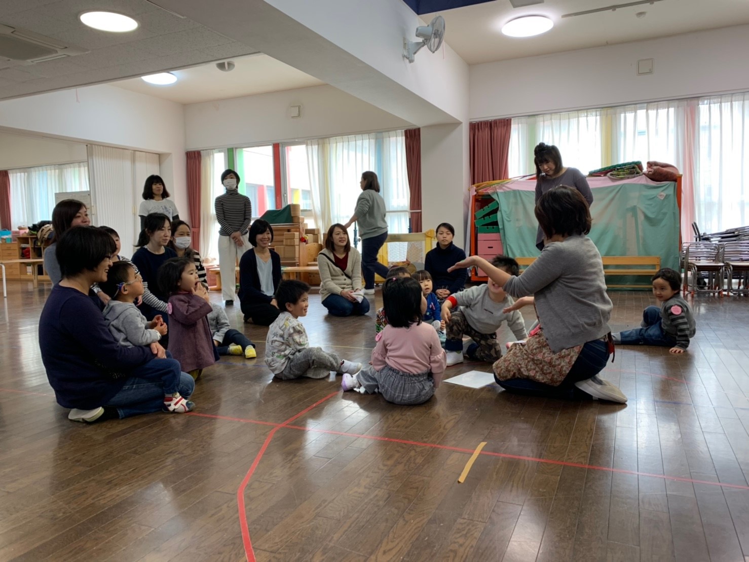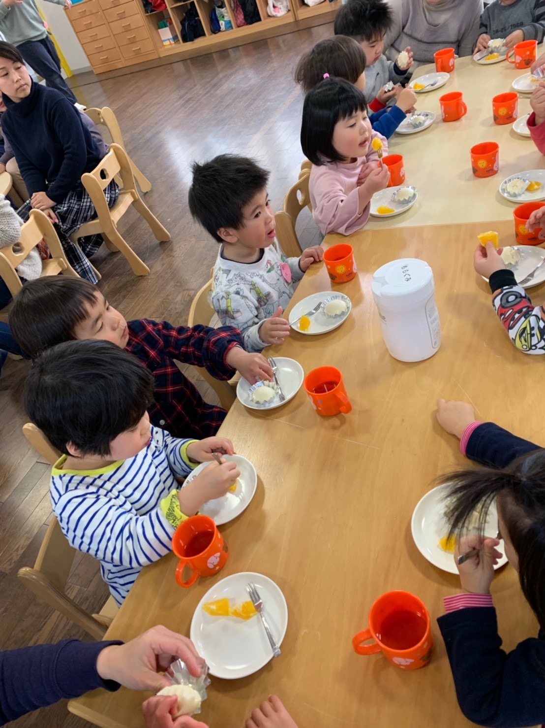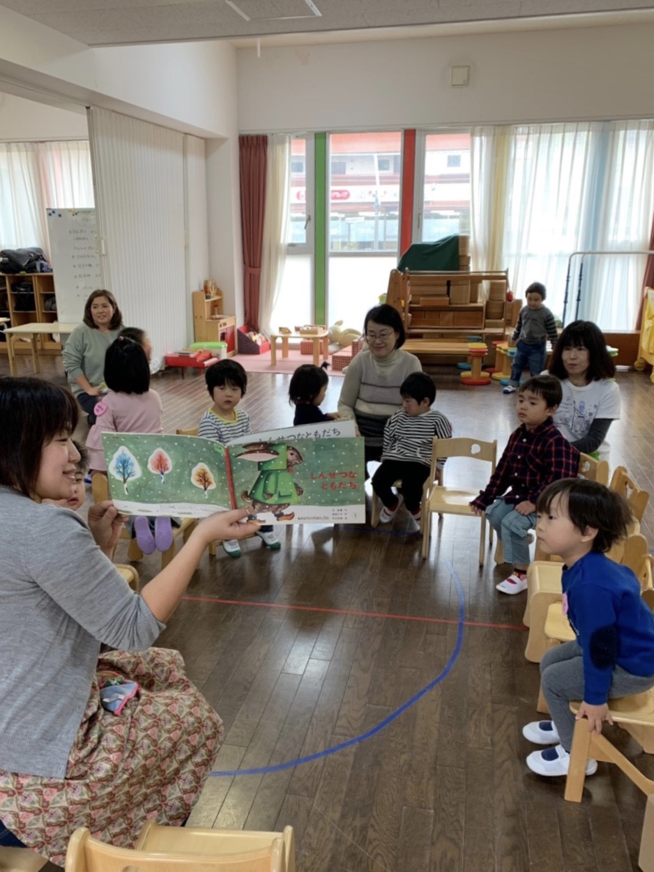お母さんと触れ合い遊びをして、なべなべそこぬけでは、大きな円になり、手をつないで、身体をかえしてみました♪はとぽっぽ体操をして、かけっこをして、おやつは手作りの蒸しパンとオレンジでした!ごちそうさまをしても、今日はもっと遊びたい様子でしたね。体力がついてきました!お帰りの会では『しんせつなともだち』を聞き、タオルでくるくるジュースを作って、さようならをしました。2018年度もも組さんは残り3回となりました。来週はお母さんと一緒に過ごした記念に、親子で手型スタンプをします!元気に登園できますように、待っています。
