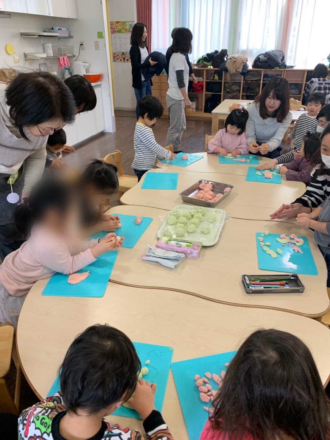 今日、もも組さんの自由遊びの時間には、さくら組のお兄さん方が積み木で素敵なお家を作ってくれました。小麦粉粘土のテーブルでは、おねえさん方が「ふわふわだよ!」「こんなに、のびるよ!」と、楽しそうな会話が聞こえ、ホールがより一段と明るくなりましたね!