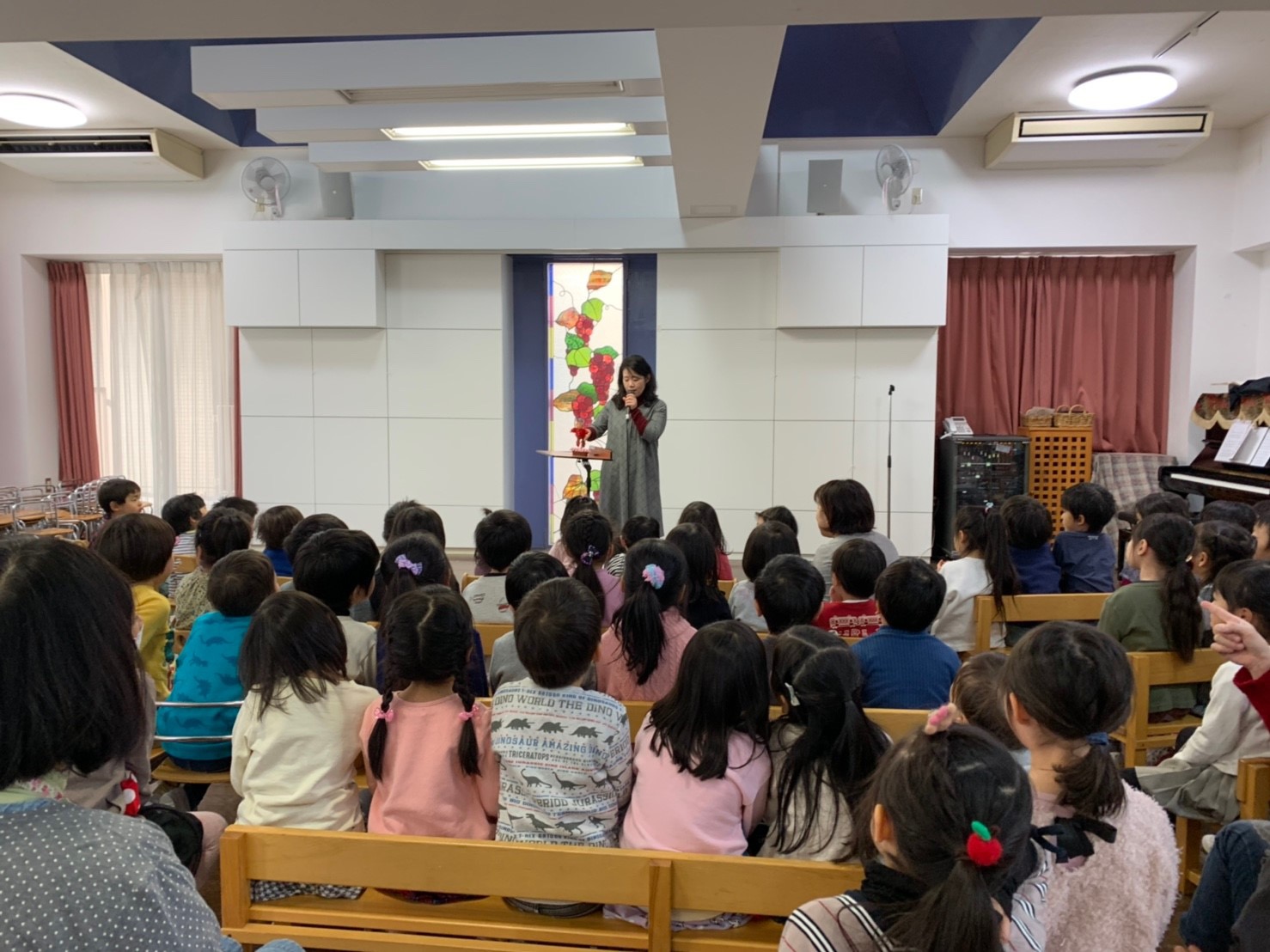 合同礼拝では、お友だち同士で一列目に並び、もも組さんもさんびかを歌い、聖書のお話をよく聞いていて、成長を感じました。今日は、わらべうたのリズムでお名前を呼び、お返事をしてもらいました♪リトミックでは大津先生に♪ゆきのペンキやさんを教えてもらいましたね、明日ゆきが降
