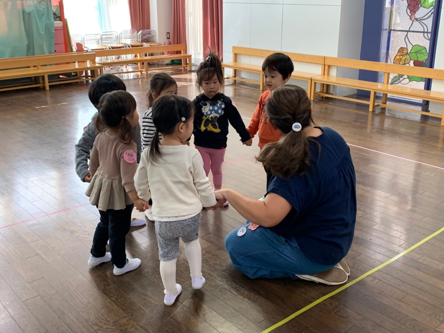 その後のリトミックでは♪ともだちっちっちの歌に合わせて、お友達とタッチしたり握手をしました。