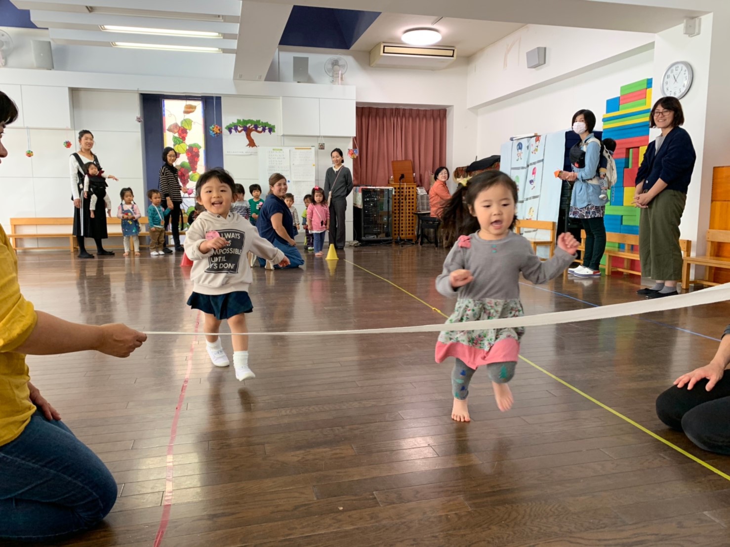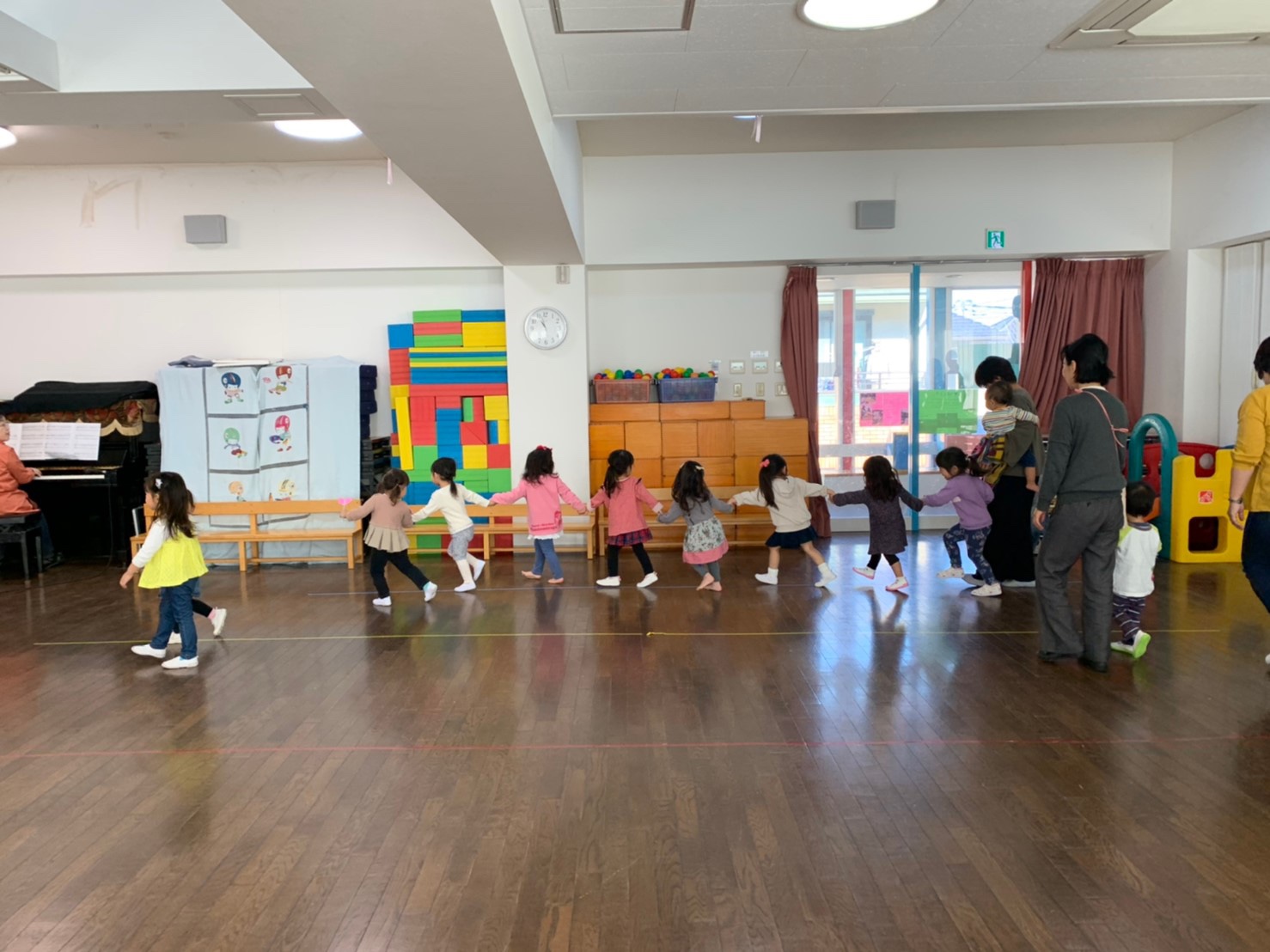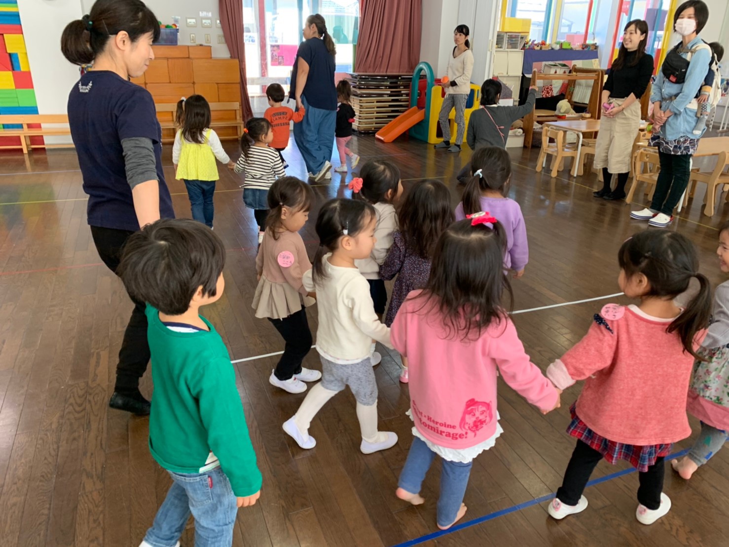 ピアノ曲エンターテイナーに合わせて、お友達と手を繋いで歩いたり止まったり、♪おおきなたいこの曲では、音の大きさに合わせて膝や頭をタンタンタンと叩いてみたりしました。