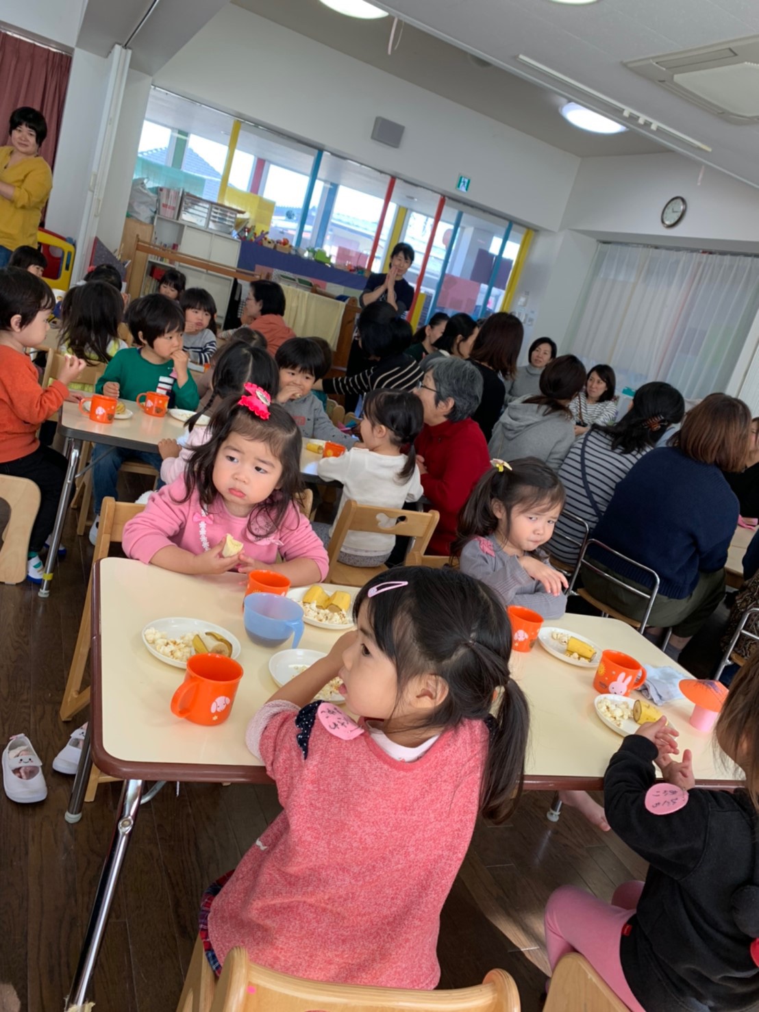「ポップコーン美味しいね!」「まだお茶残ってるよ~!」「バナナの皮むいてあげる!」など、お友達とお喋りしながら楽しく頂きました 。