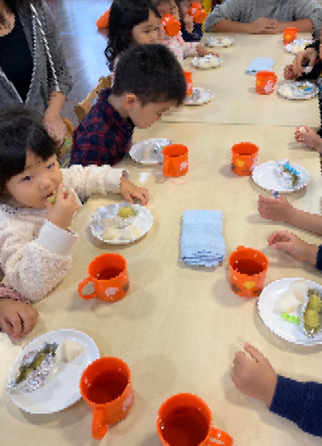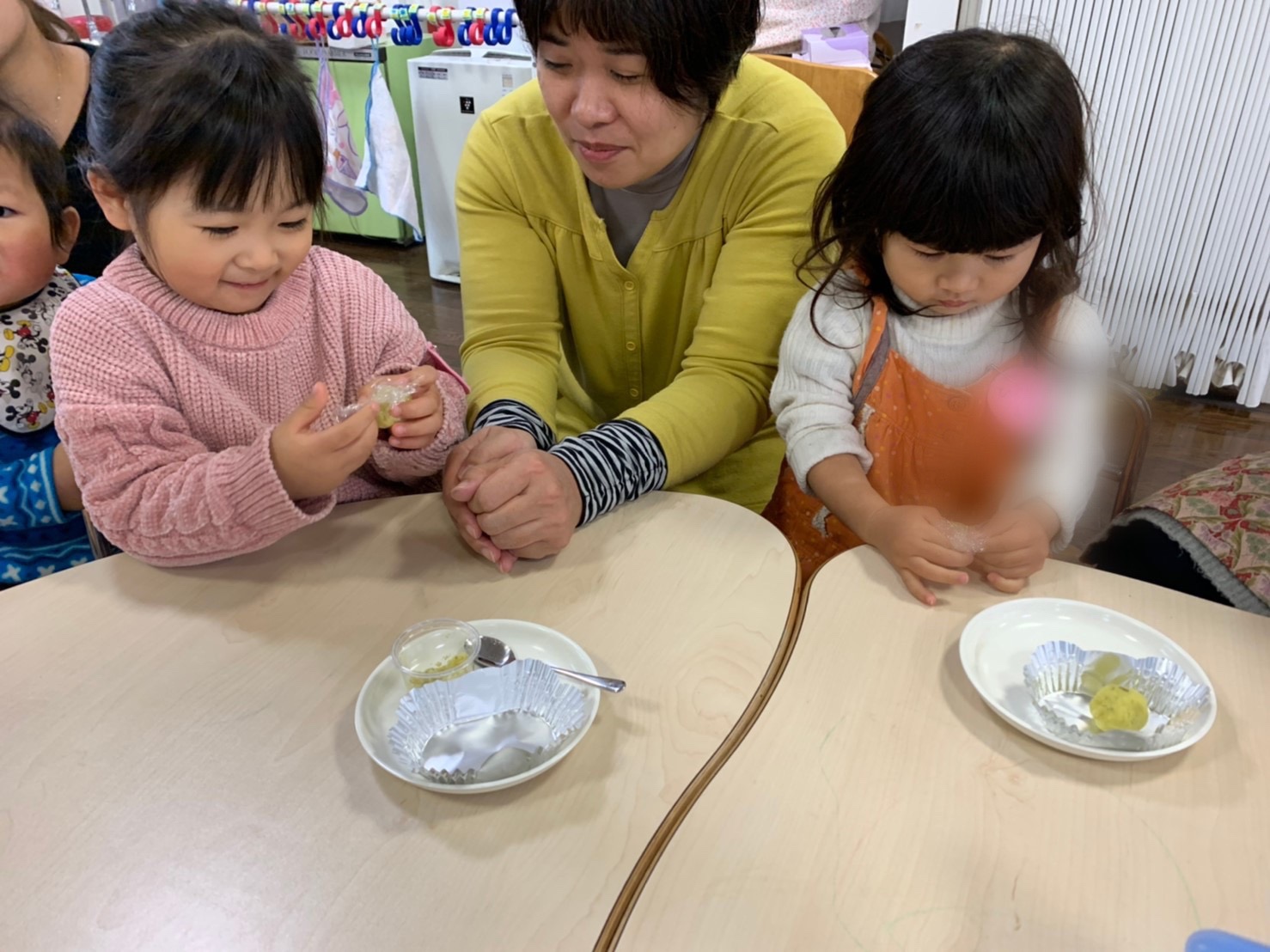 芋に砂糖を混ぜたものをお母さんと一緒に丸めて茶巾絞りにしました。