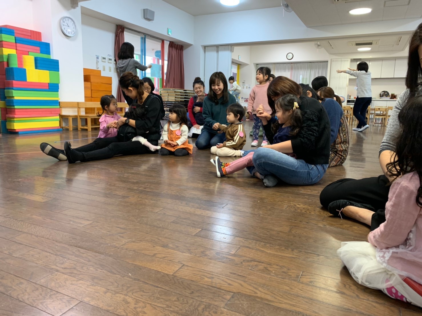 音楽遊びは、歌って手をつなぎお母さんと2人組から始まり、みんなで一つの輪になりました。
