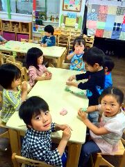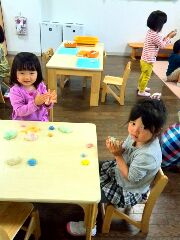 ゆりさん 小麦粉粘土で遊びました お知らせ イベント 今日のひとこま 2014.05.13 小麦粉にお水を混ぜていきました。「うわぁー、べたべた」でもだんだんまとまっていく様子に、「パンみたい! 気持ちいい~」と大喜び。今日は絵の具を混ぜて綺麗な粘土を作って楽しみました。