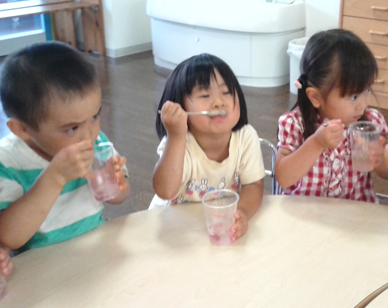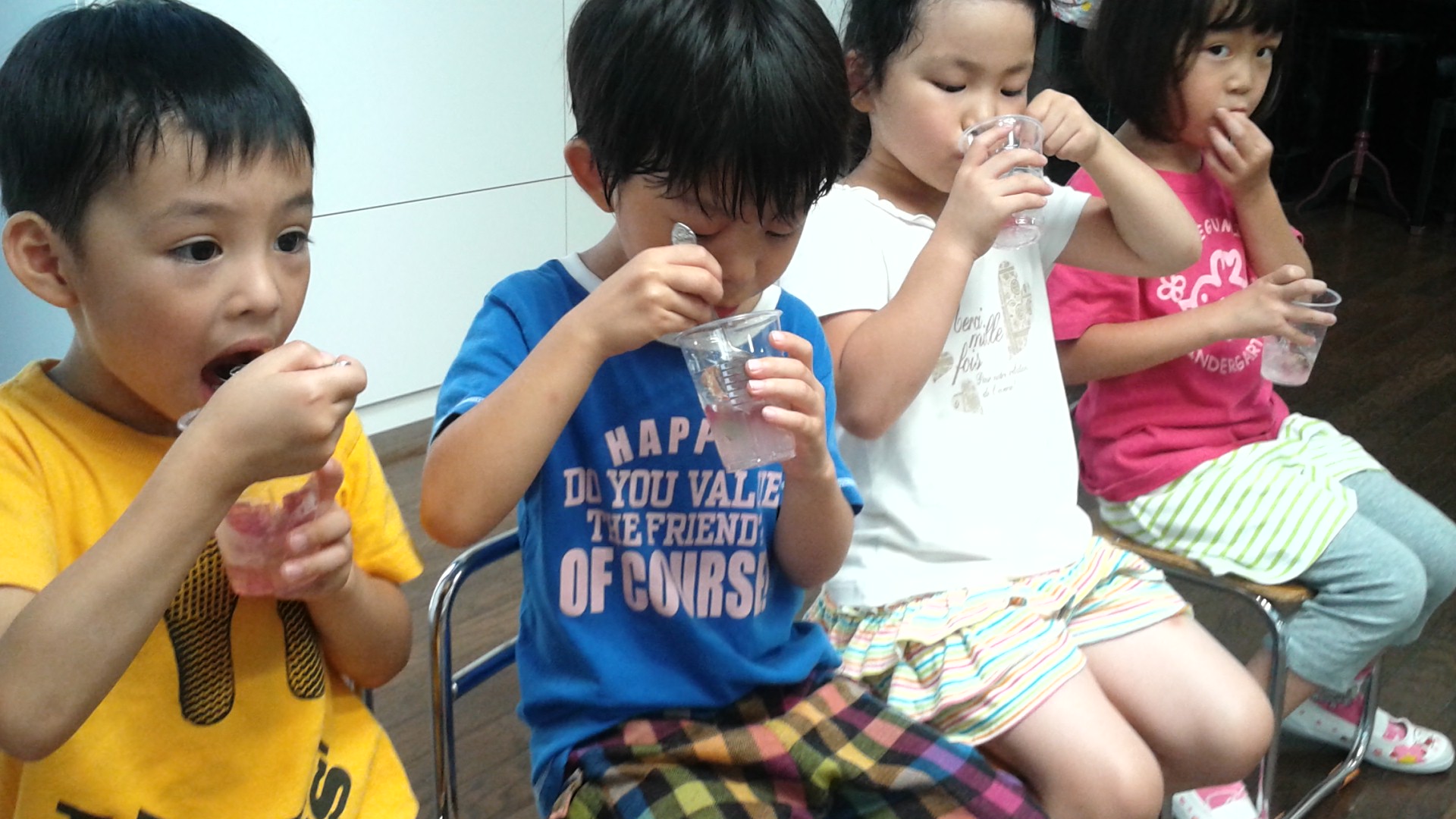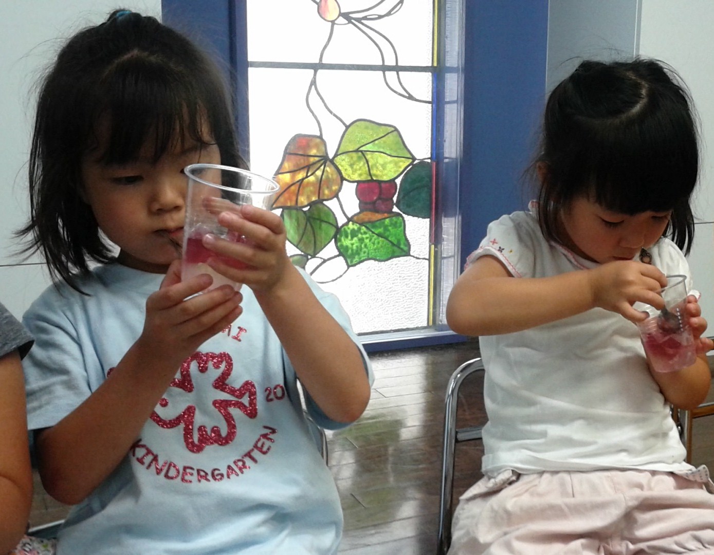 今日は体操の後…年長さんがお祈りをして、冷たく美味しく固まったゼリーを皆でいただきました。