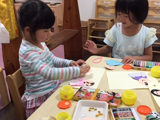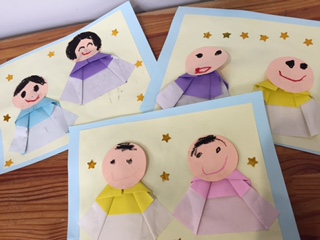 今日は、折り紙で身体を折り、顔を描いて、台紙に貼る…という、いくつくかの行程を行いました。