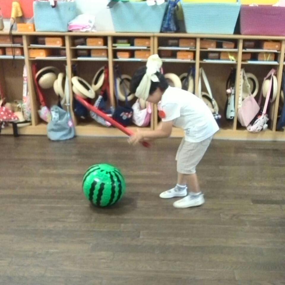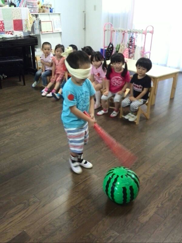 目隠しをして、すいかを狙って歩きます。周りのお友だちは「まっすぐ」「みぎ」「ひだり」「いきすぎ」「そこ」と声をかけます。”ここ”と思ったところを棒で思い切り叩きます。当たるまで何度も床を叩くお友だちも。