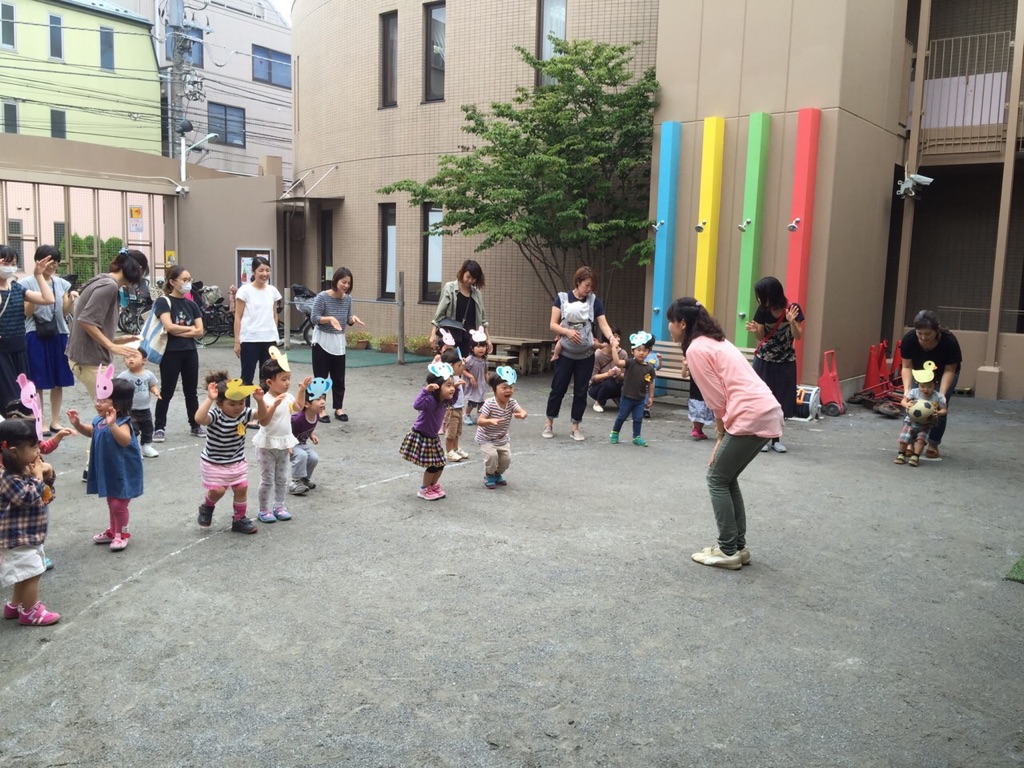お天気に恵まれた今日のもも組。園庭で、元気良くどうぶつ体操を踊りました。かわいいどうぶつさんがいっぱい。とても楽しそうでした。