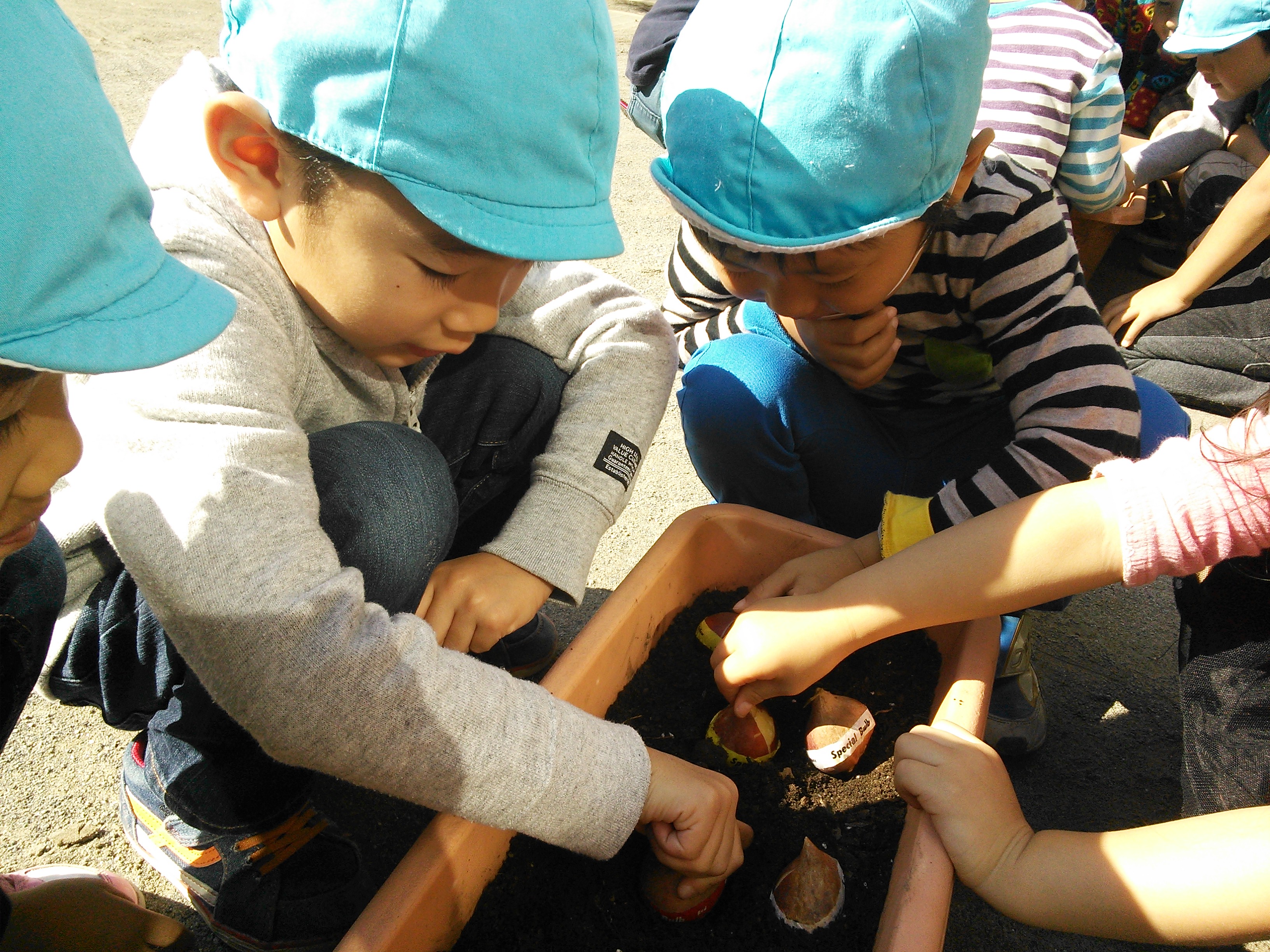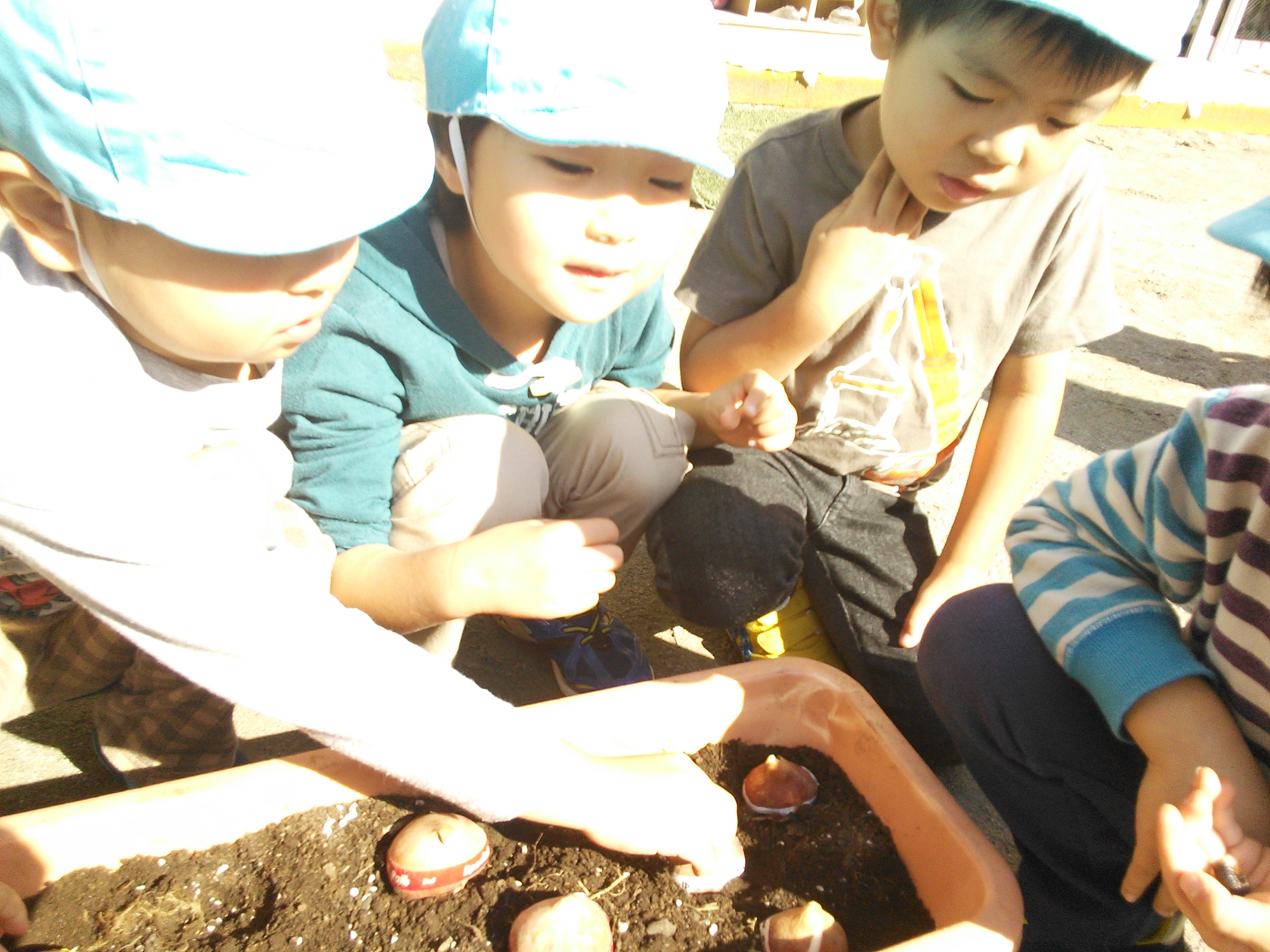今日は、各クラスの子どもたちが球根を植えました。