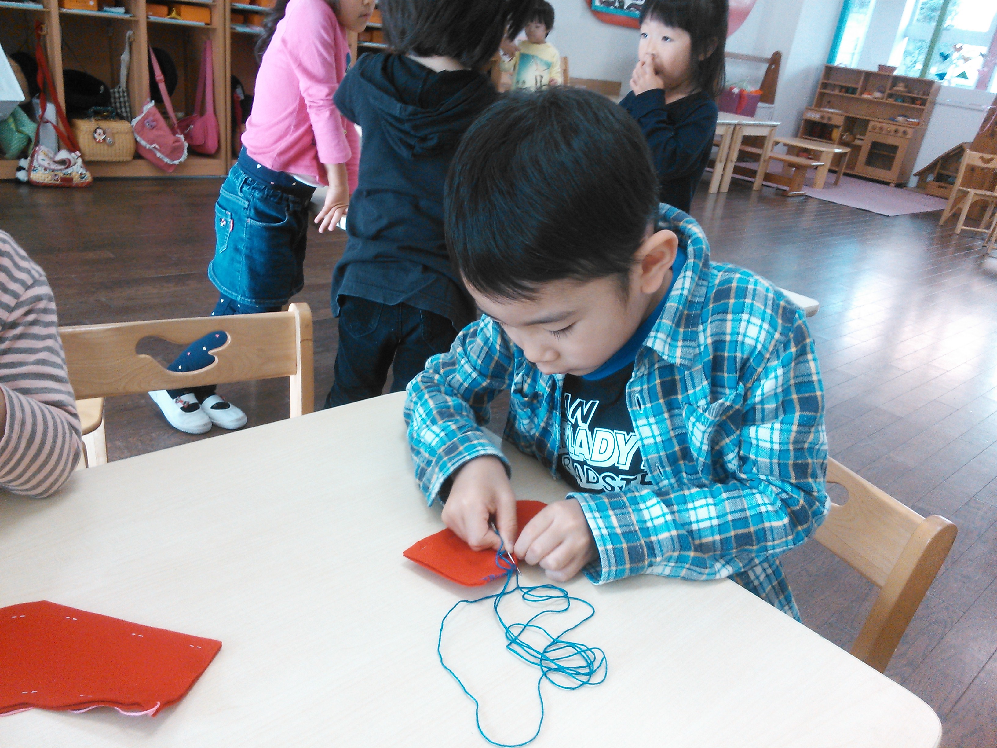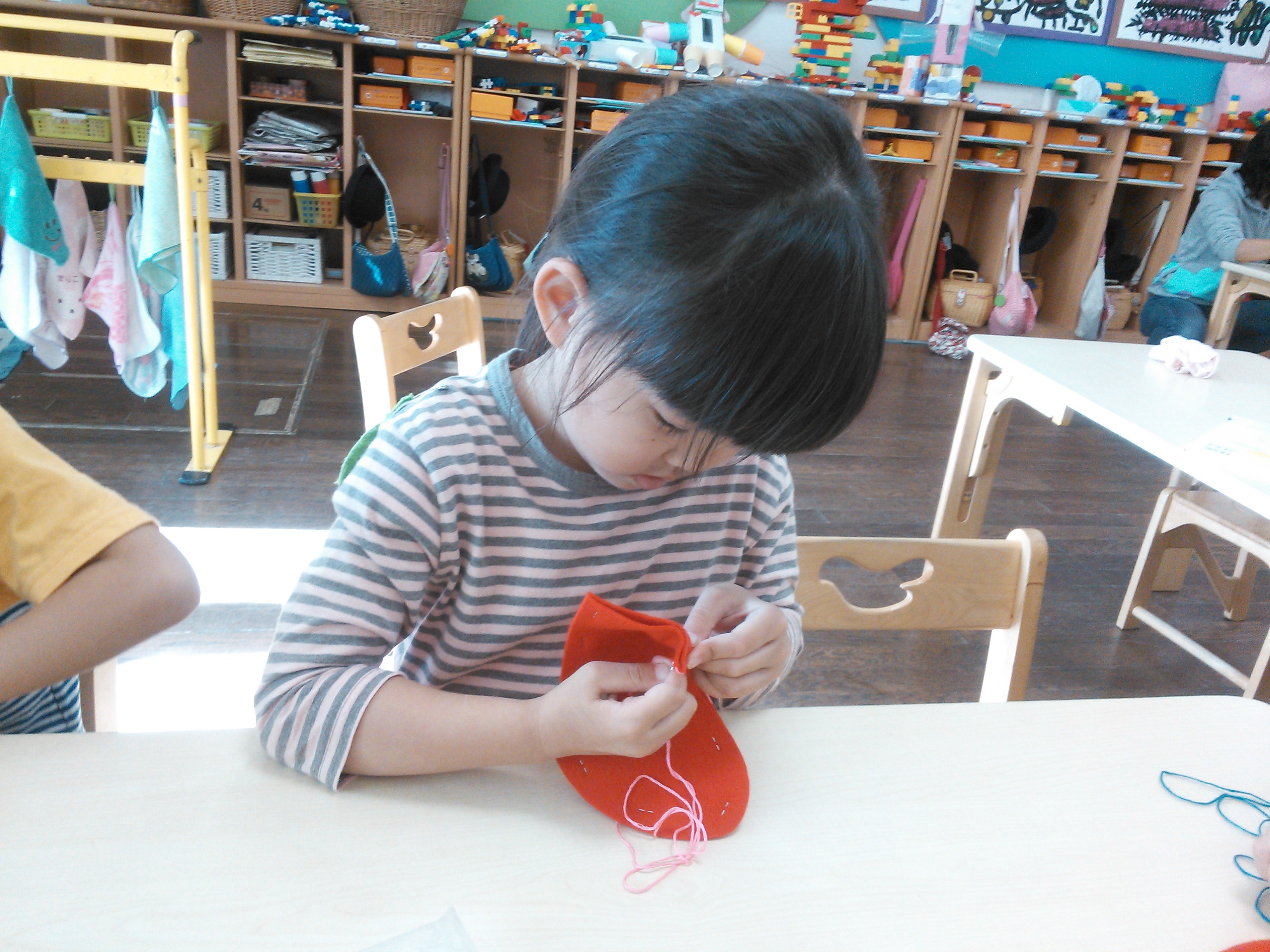 フェルトを2枚重ねて毛糸針で縫っています。