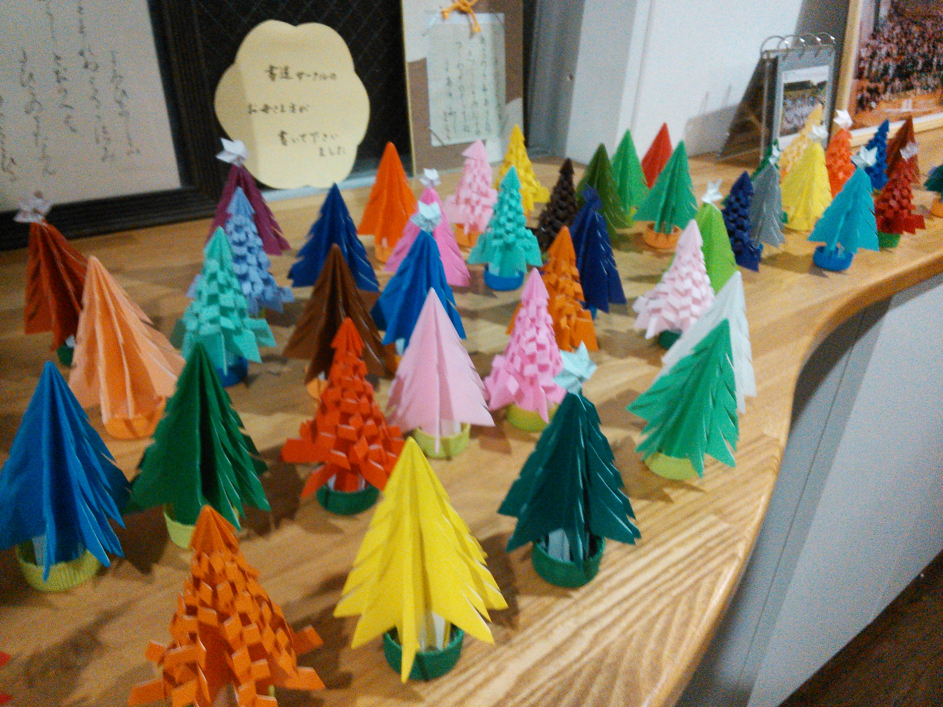 そして、夕方には教会の方が折り紙で折った色とりどりのツリー持ってきて下さいました。