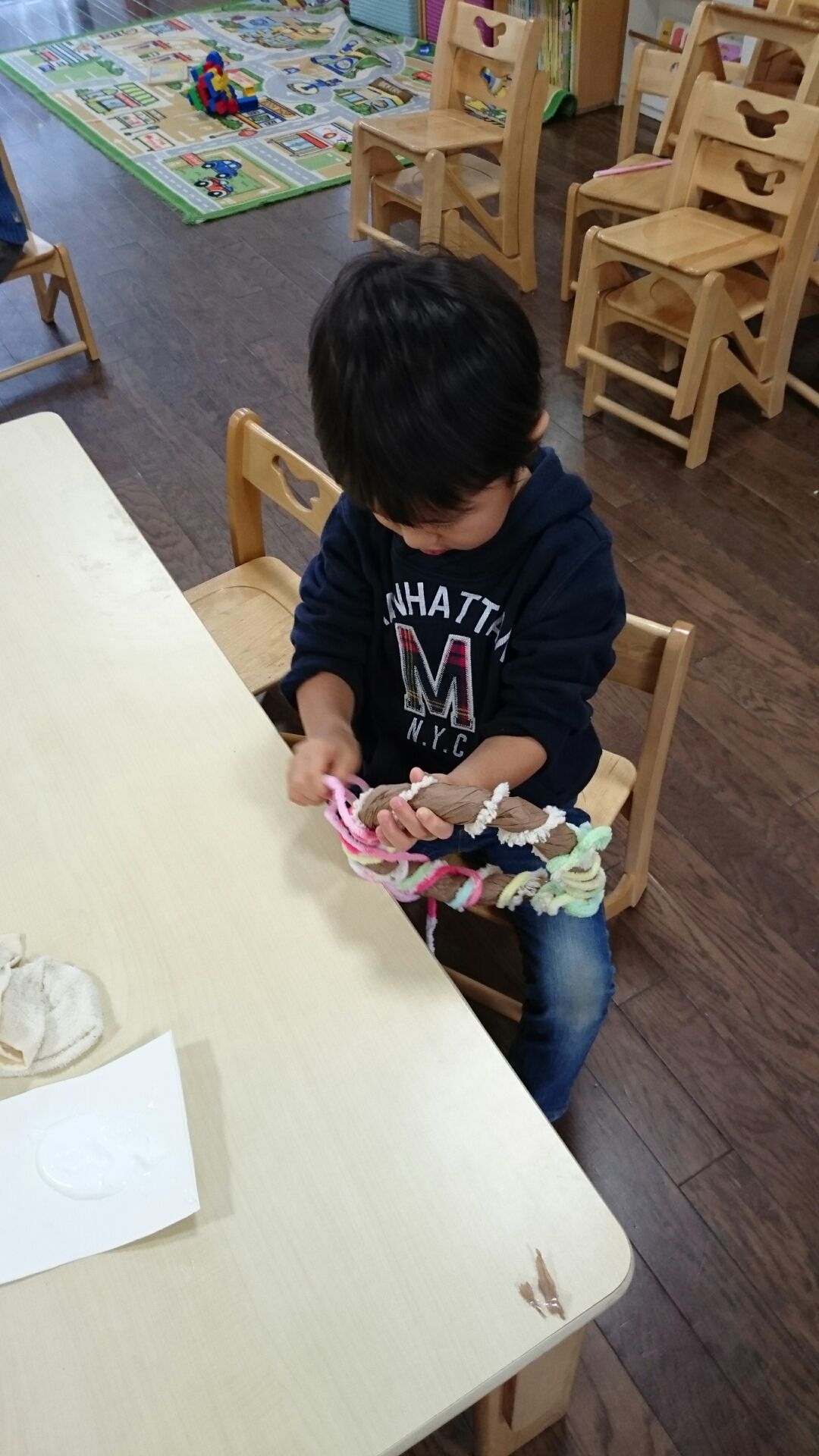 土台は茶色の紙でひねった新聞紙を巻いて丸くしました。そこへ毛糸を巻いて、丸めたボールを付けていきました。
