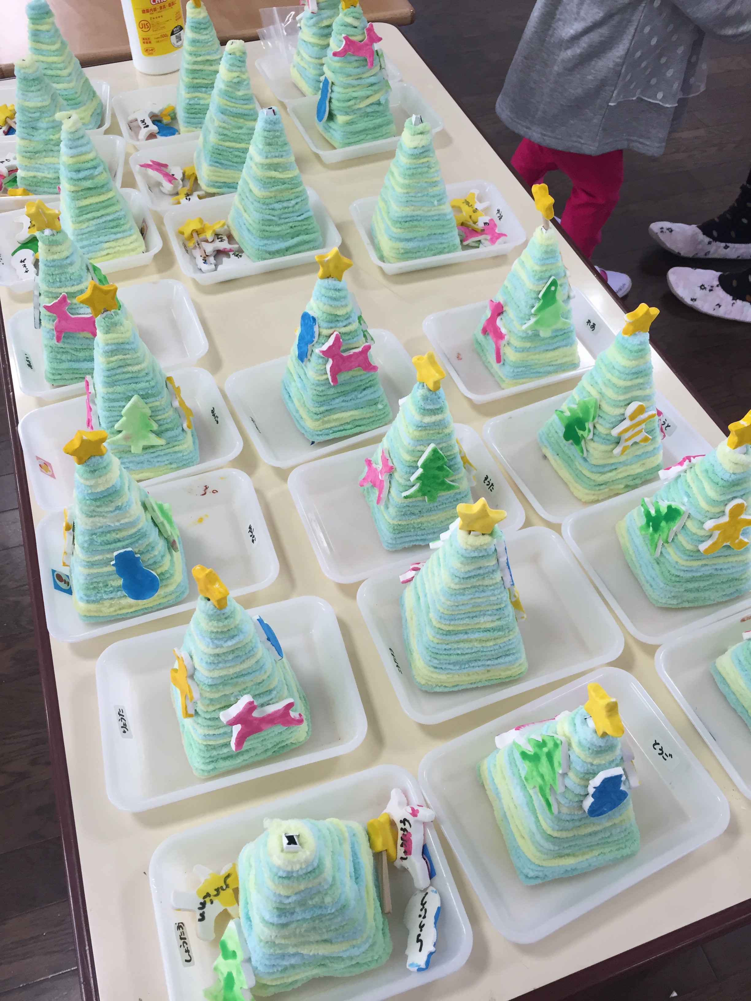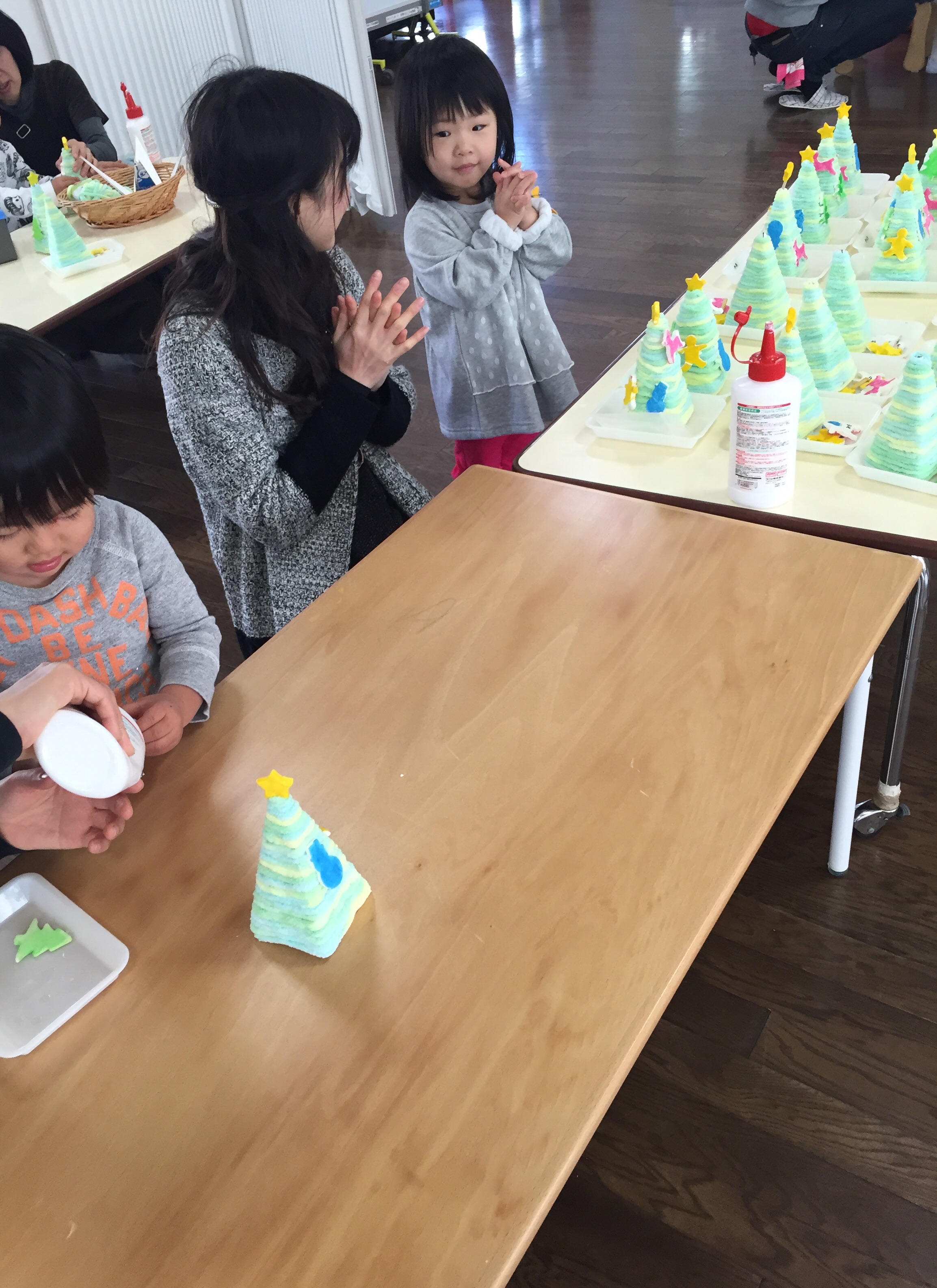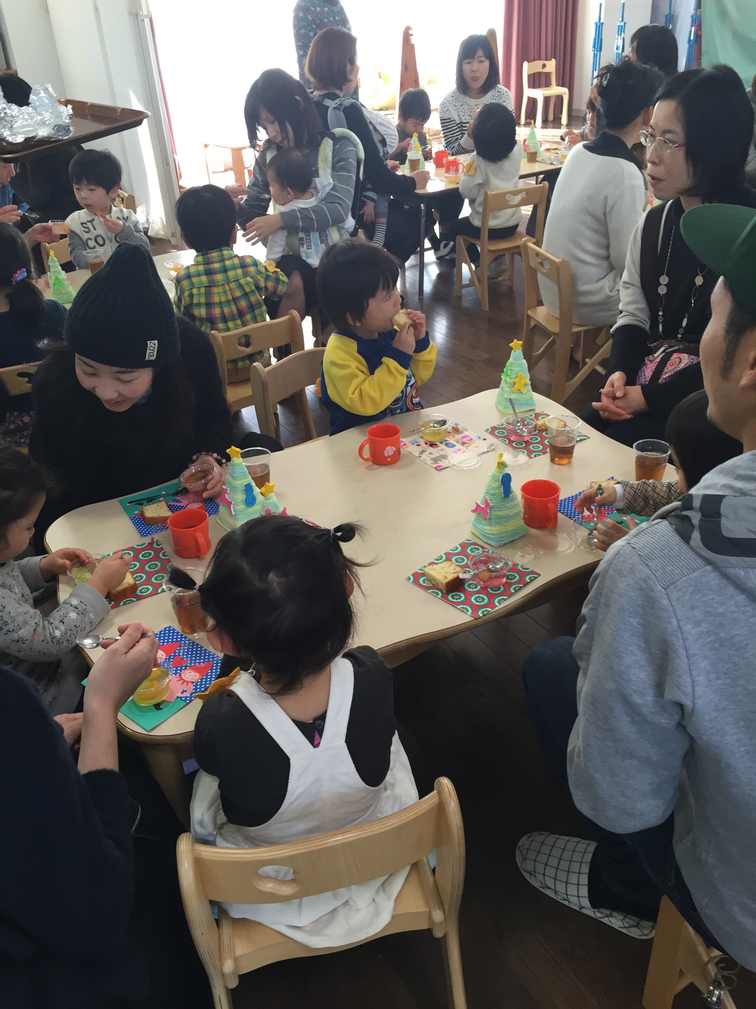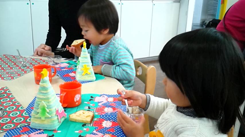 おうちの方と一緒に作った、世界に一つだけのクリスマスツリーを飾ってクリスマスパーティー。手作りの美味しいおやつをいただきました。おうちの方も、お友達も、にこにこしていて、心に明るい光が灯ったようでした。