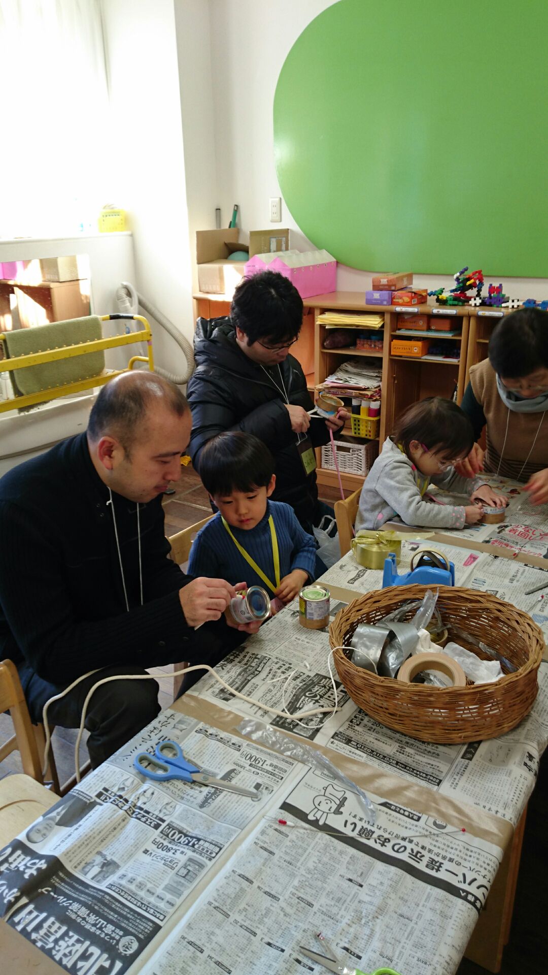 穴を開けるのも、紐を通すのも…子供だけでは出来ない事でしたが…おうちの方と一緒に作って、みんなステキな缶ぽっくりができていましたね。