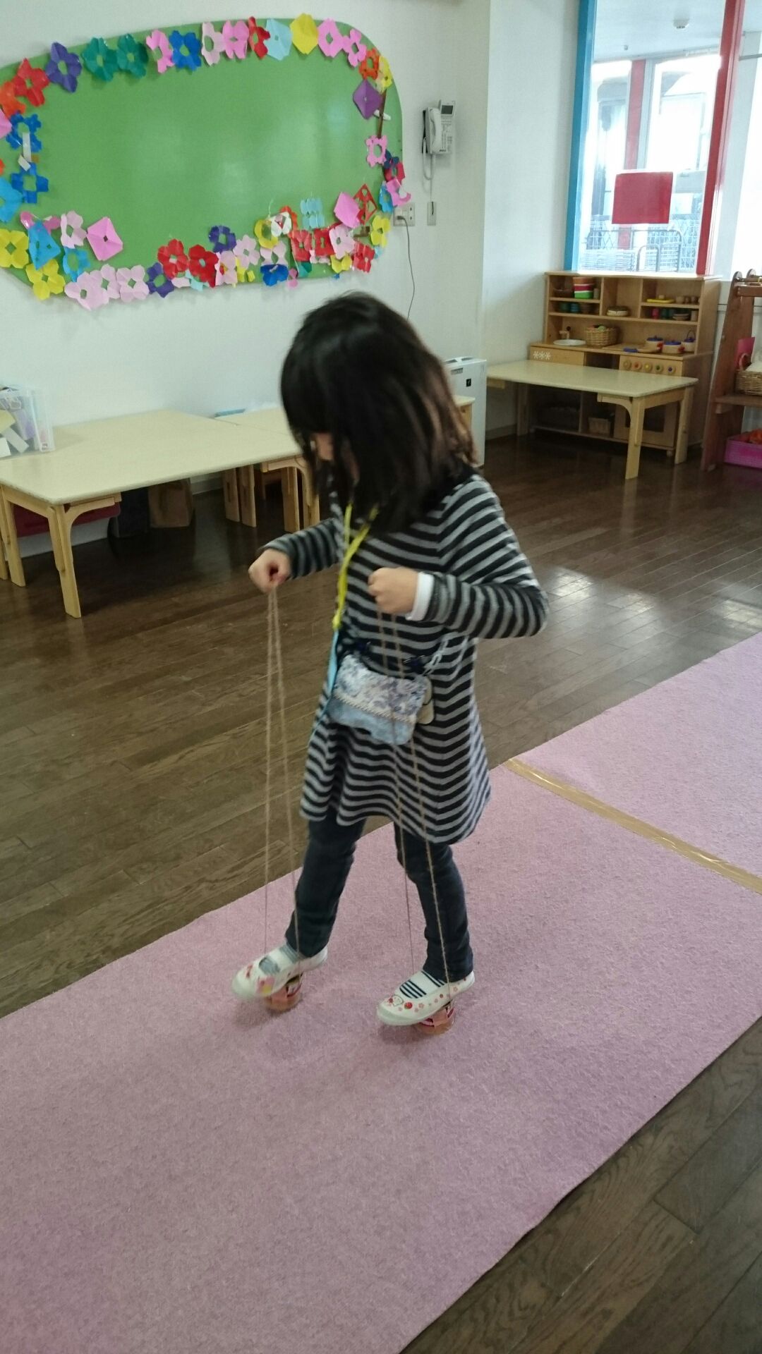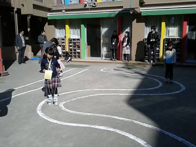 缶ぽっくりで、歩くのも…上手になって、園庭で色々なコースで、歩いてみせてくれました。
