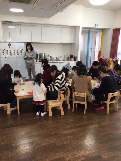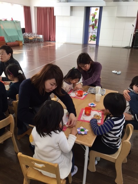 いつも一緒のおうちの人と、ちょっとだけ離れて遊ぶ時間がありました。おうちの方々はお隣りの部屋で、みんなのために折り紙でコマ作り。もも組さんは自分たちでソフトブロックを運んでアスレチック。少しの時間でしたが、成長が見られた時間でした。まだおうちの方と一緒にいたいお子さんも、ちょっとずつ、ちょっとずつ。。。入園に向けて準備して行きましょう。もちろんおうちの方々と一緒に楽しく過ごす時間もたくさんとって行きましょう。くるくる回る花ゴマはとてもきれいで、子どもたちも大喜びでした。ご協力、ありがとうございました。