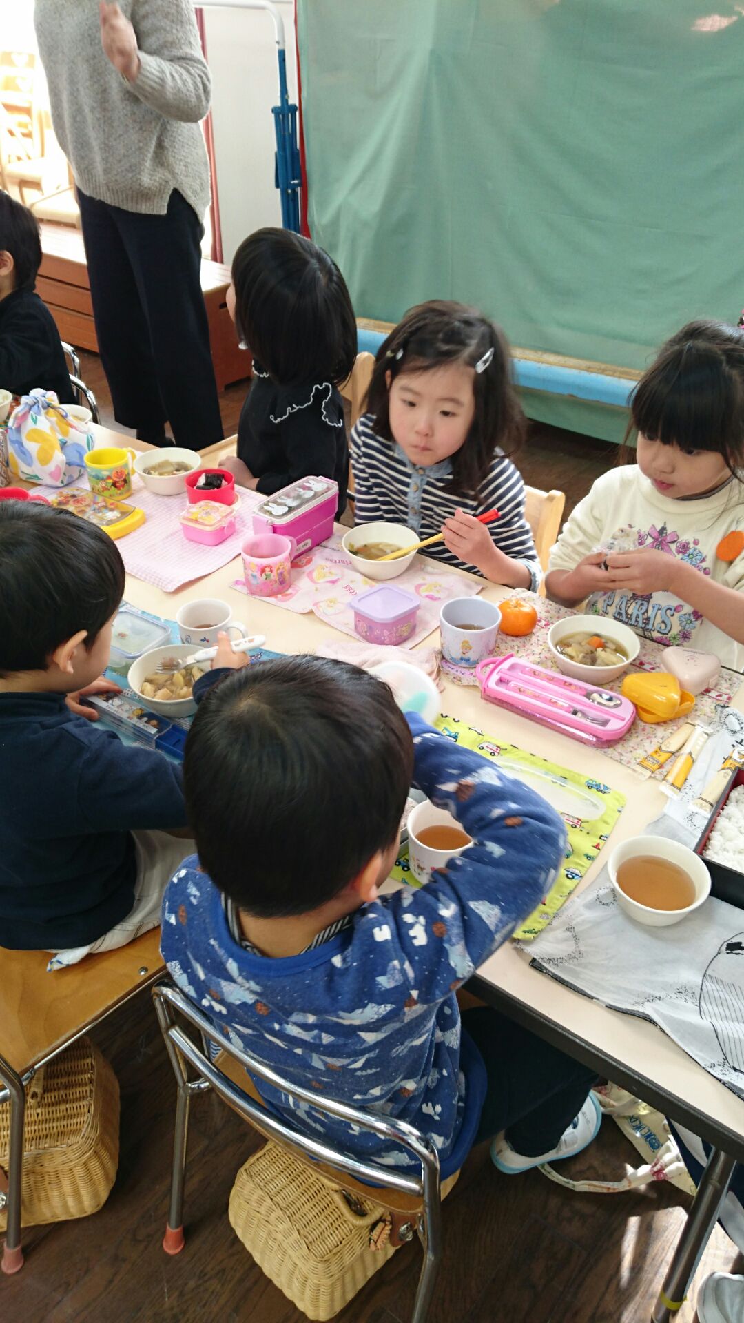 ホールで全クラスがグループに分かれて頂きました。まだお庭には昨日の雪が残り冷たい一日でしたが、温かいすいとんを頂き、心も体もほっこりしました。