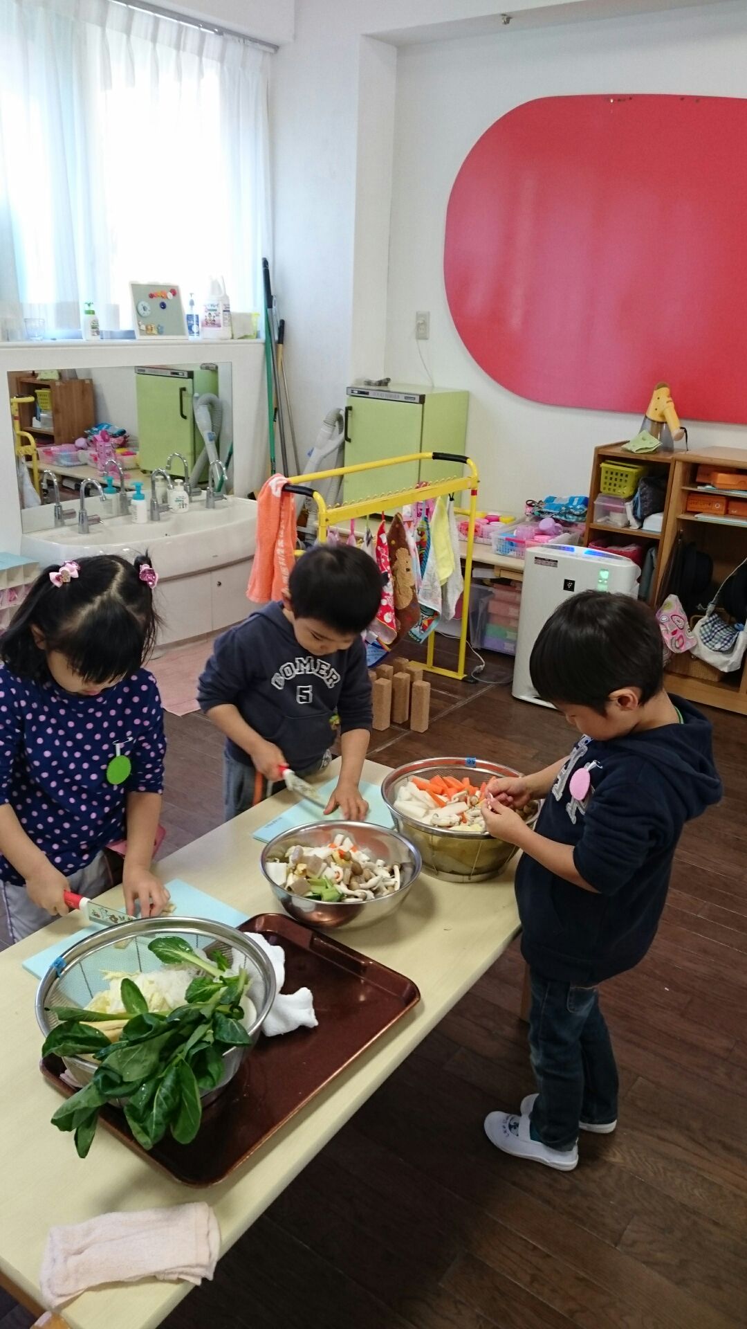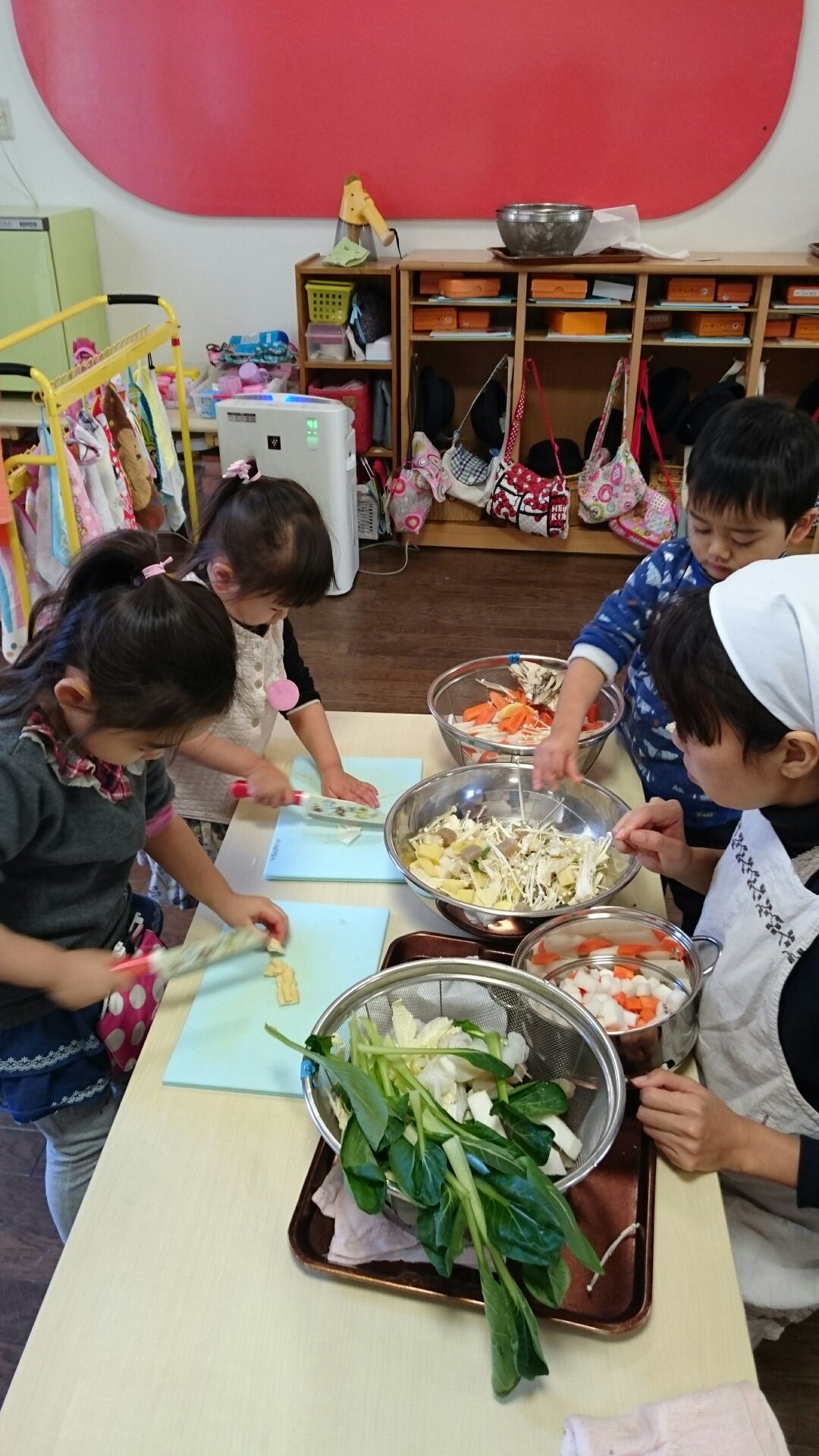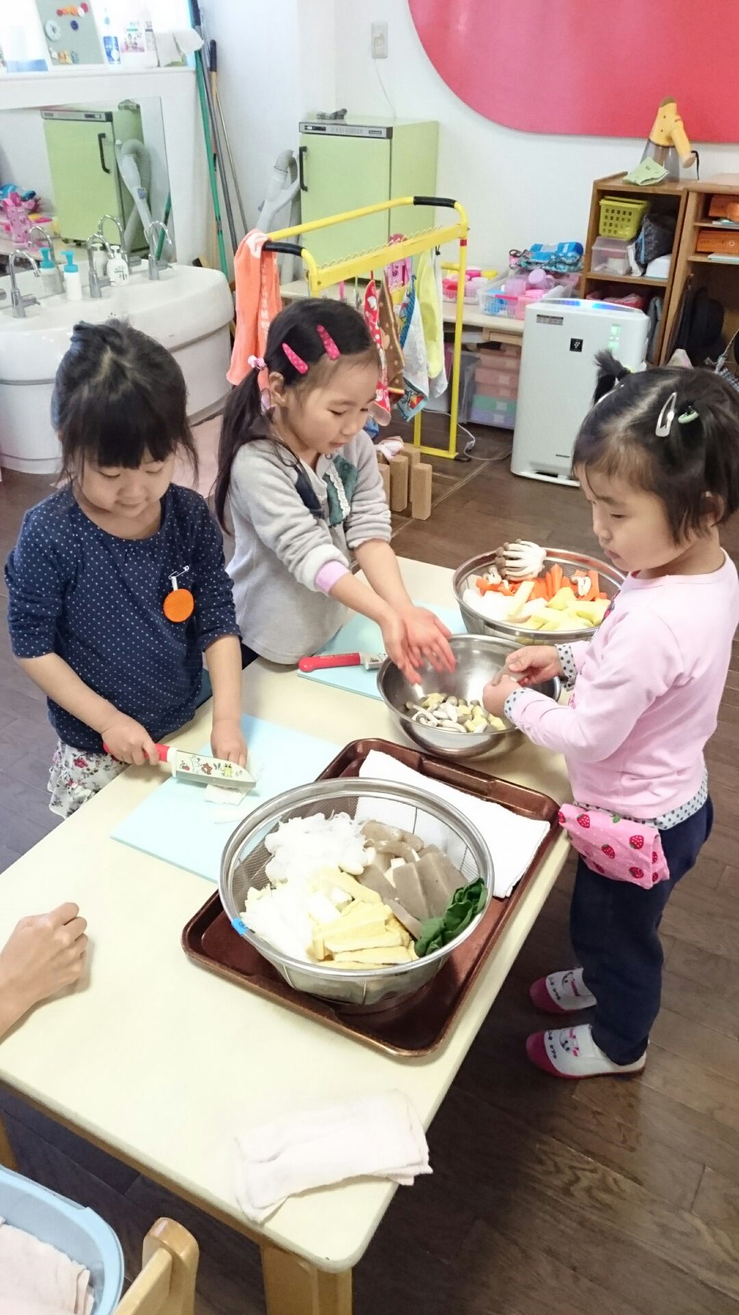 今日はゆり・たんぽぽ組ですいとんを作りました。今日ゆりさんはお汁の担当でした。金曜日に持って来て頂いたお野菜や具材を包丁で切りました。ゆりさんは包丁を使うのは3回目、随分上手になってきました。大根、人参、小松菜、白菜、薄揚げ、こんにゃく、きのこ類たくさんの具材が入ったお汁にたんぽぽさんがすいとんを作って入れてくれました。