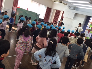 体操が終わるとお帰りのお支度…。 チーム対抗ゲームで盛り上がり、あっという間に幼稚園の時間は終わりました。 明日は、誕生日会。1月生まれの お友達のお祝いを皆でしましょうね。