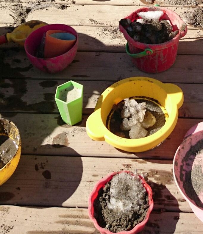 手に持って冷たさを味わったり、おままごとに使って遊びました。