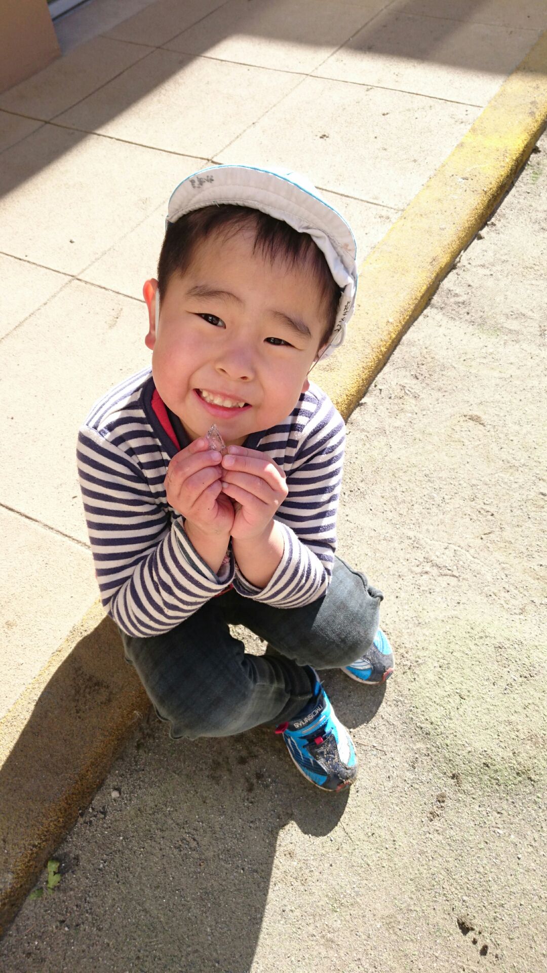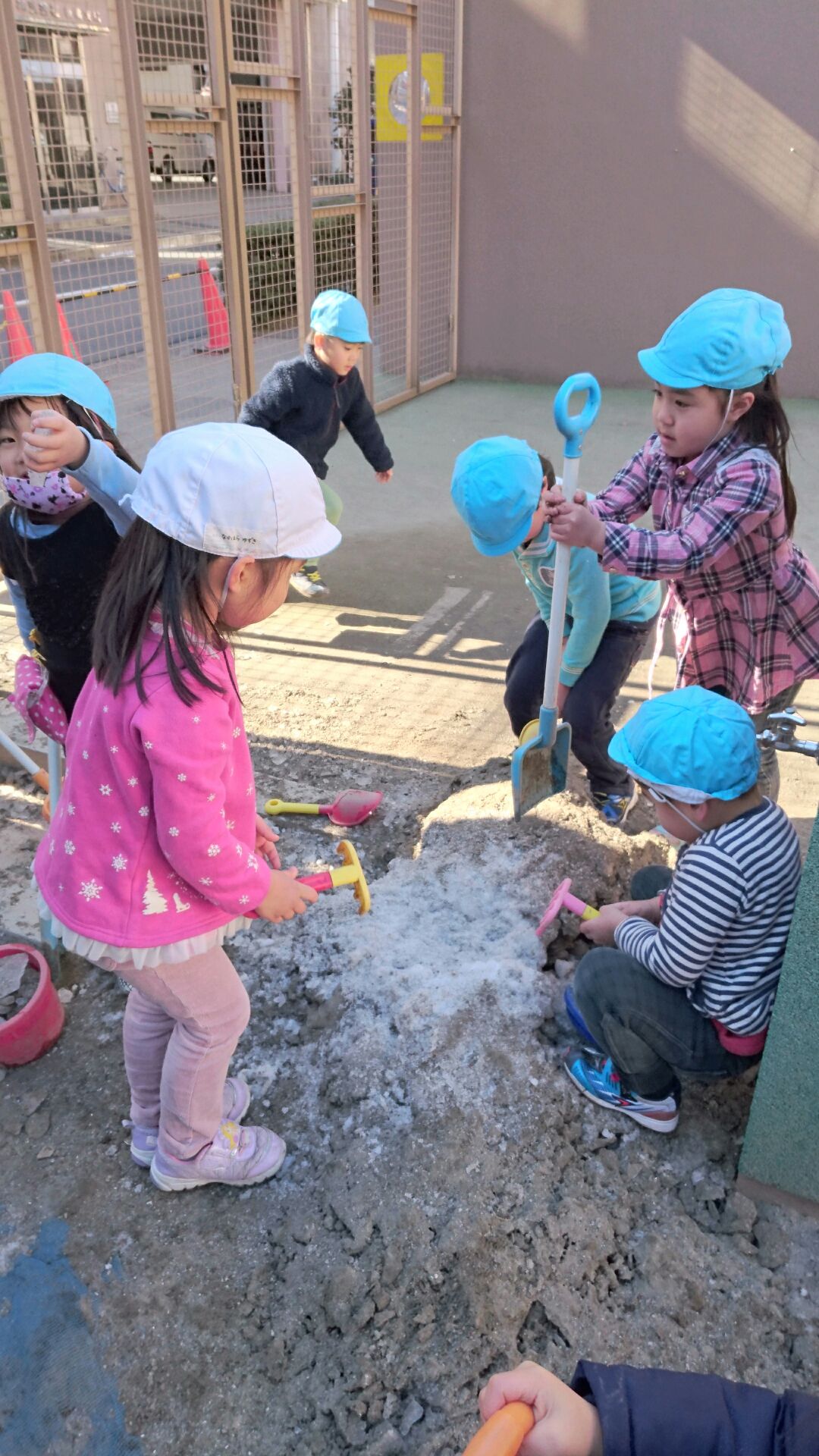 まだ砂場には雪が残り、カチカチに凍っています。雪や氷を見つけて大喜びのお友だちは砂の混ざった山を掘っていきました。寒さや冷たさなんて気にしない。すると、中には綺麗な氷が! お日さまが当たるとキラキラ光って、宝物のようです。