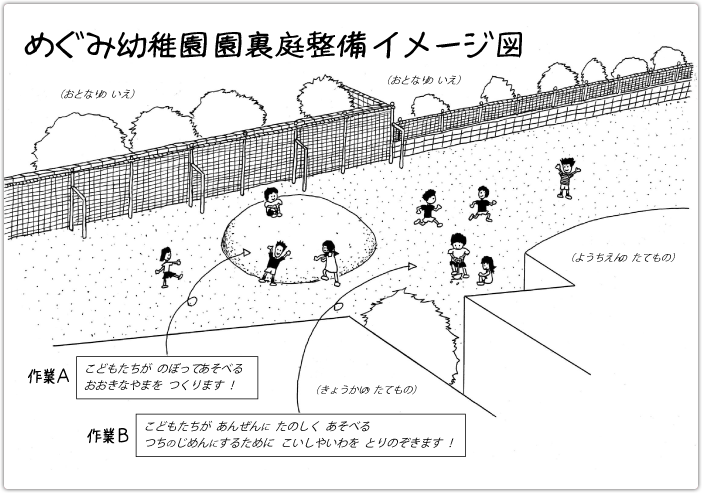 それに先立ち先日配布したお手紙で7月18日(月)に お父さま方にお手伝いを募りましたが、裏庭のイメージ図が出来上がりました。