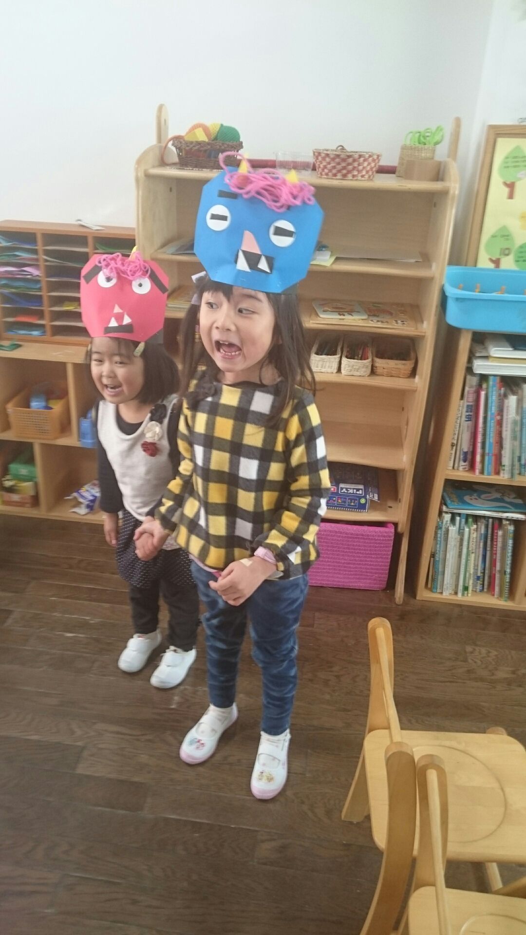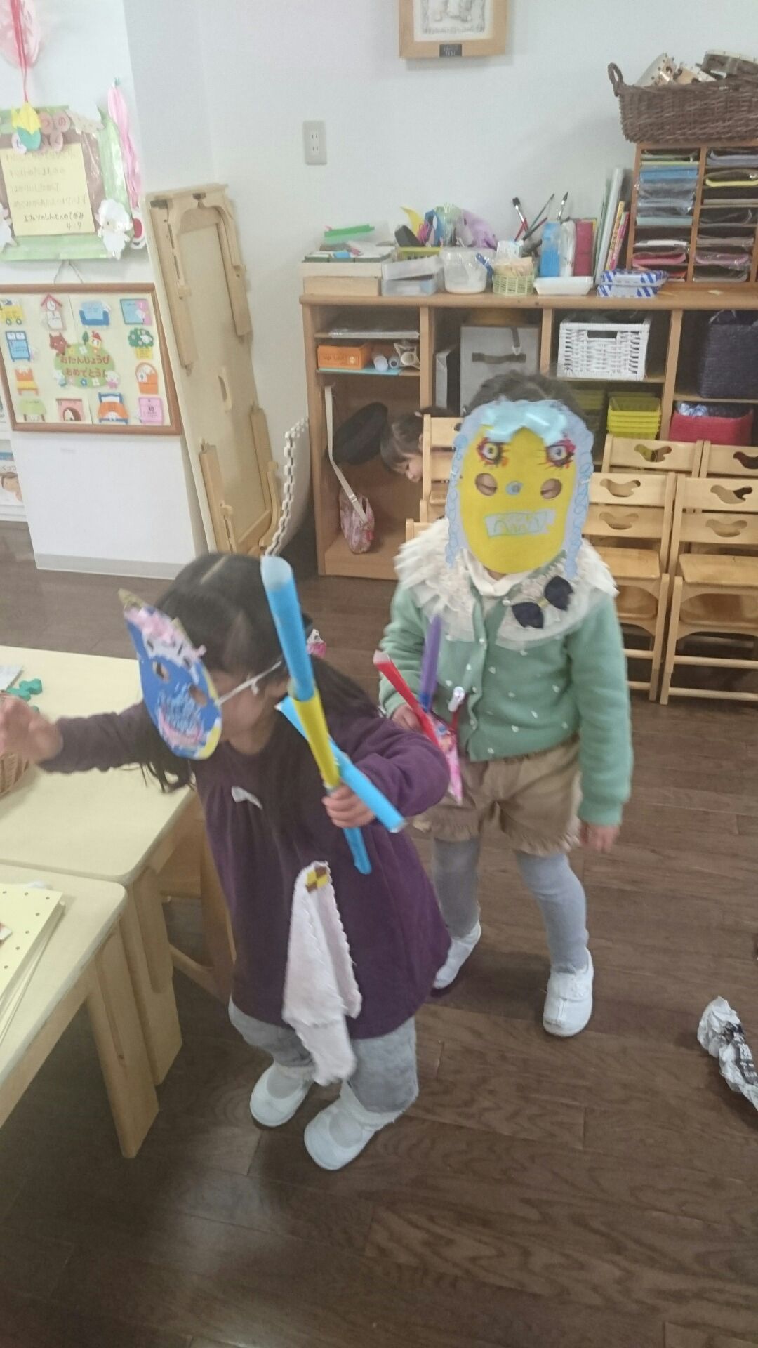 鬼のお面を着けてたんぽぽさんまで忍び足で行き、一気にお部屋に入り怖い顔で「がお~」  たんぽぽさんは「たんぽぽだから怖くないよ」と言っていましたが、ゆりさんは大満足。