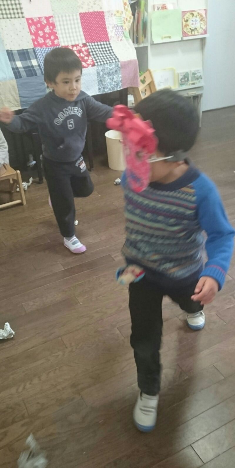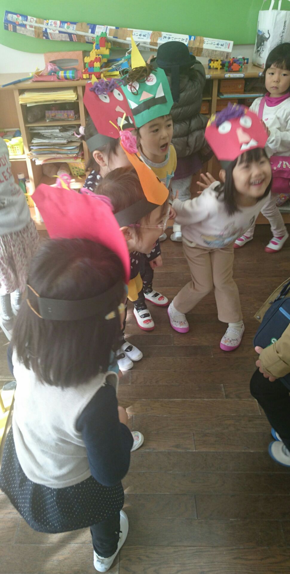 朝の時間ゆりさんがお部屋で遊んでいると、突然鬼が入って来ました!  たんぽぽ鬼たちです。急いで新聞で豆?を作り「鬼は外」     必死の応戦。強そうなたんぽぽ鬼を追い帰しました。