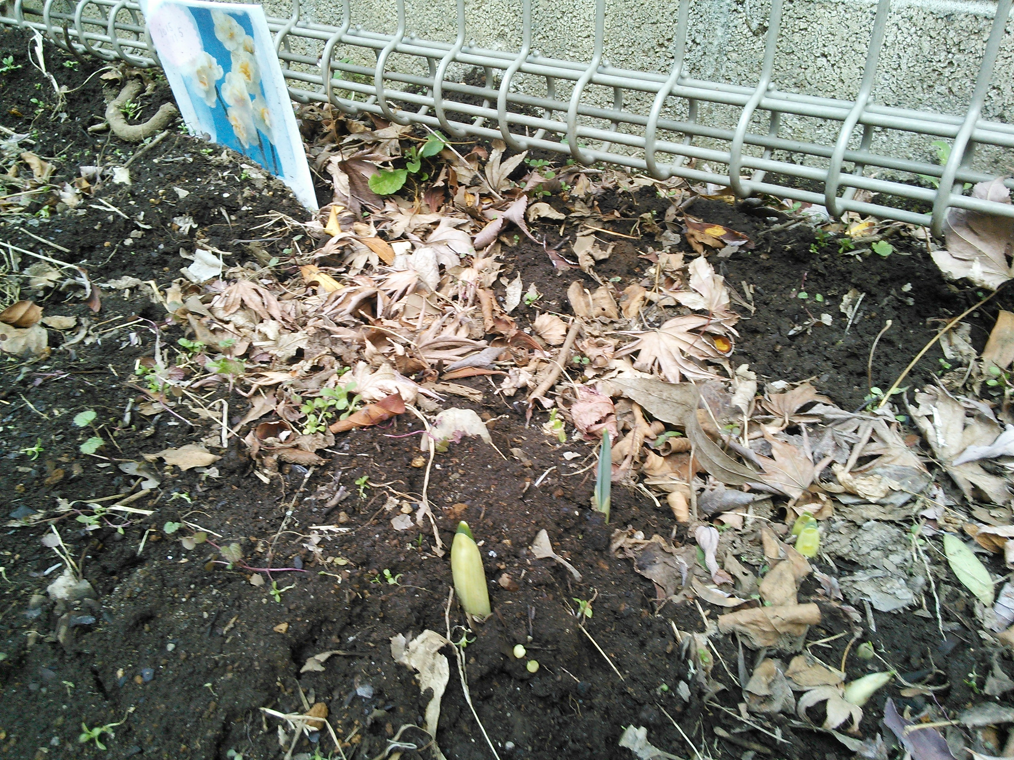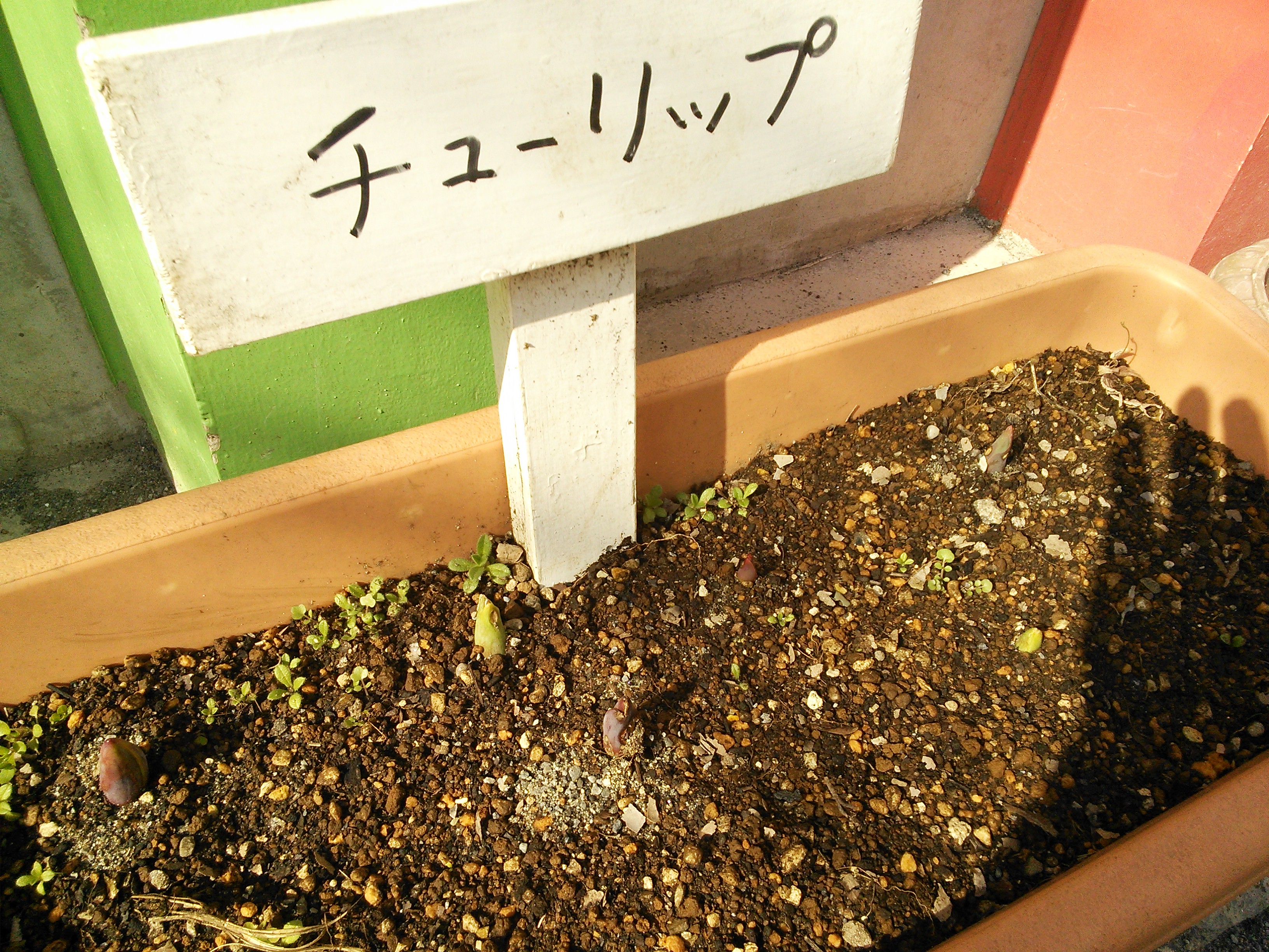 チューリップの芽を見て…                 ”わぁ、おおきいね!すこし、ひらいてる