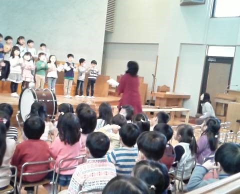 何曲も歌う年長さんを年少、年中さんは真剣な表情で見ています。