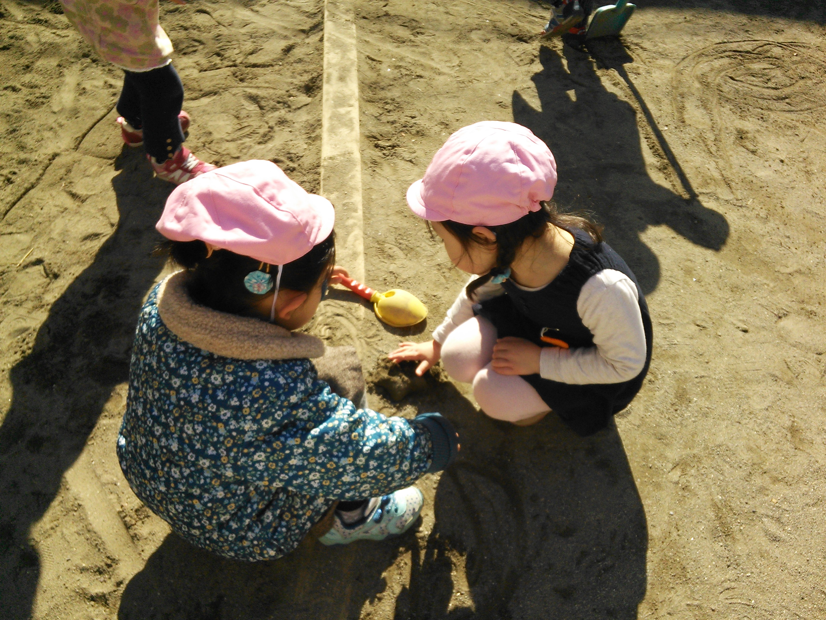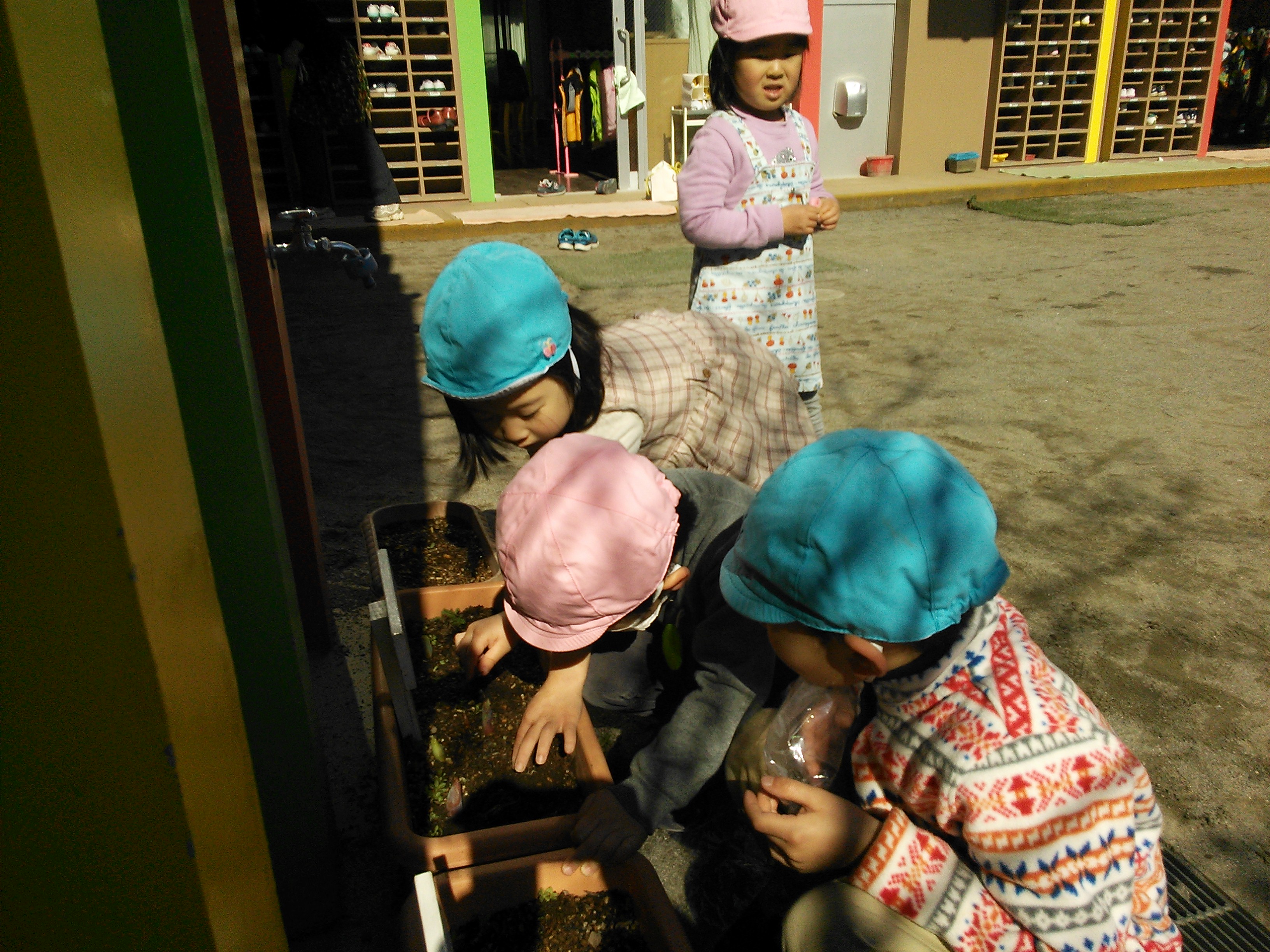 午後には、明るい光の中を鬼ごっこで走り回ったり、チューリップの可愛い芽を見たり、様々なことをして遊びました。