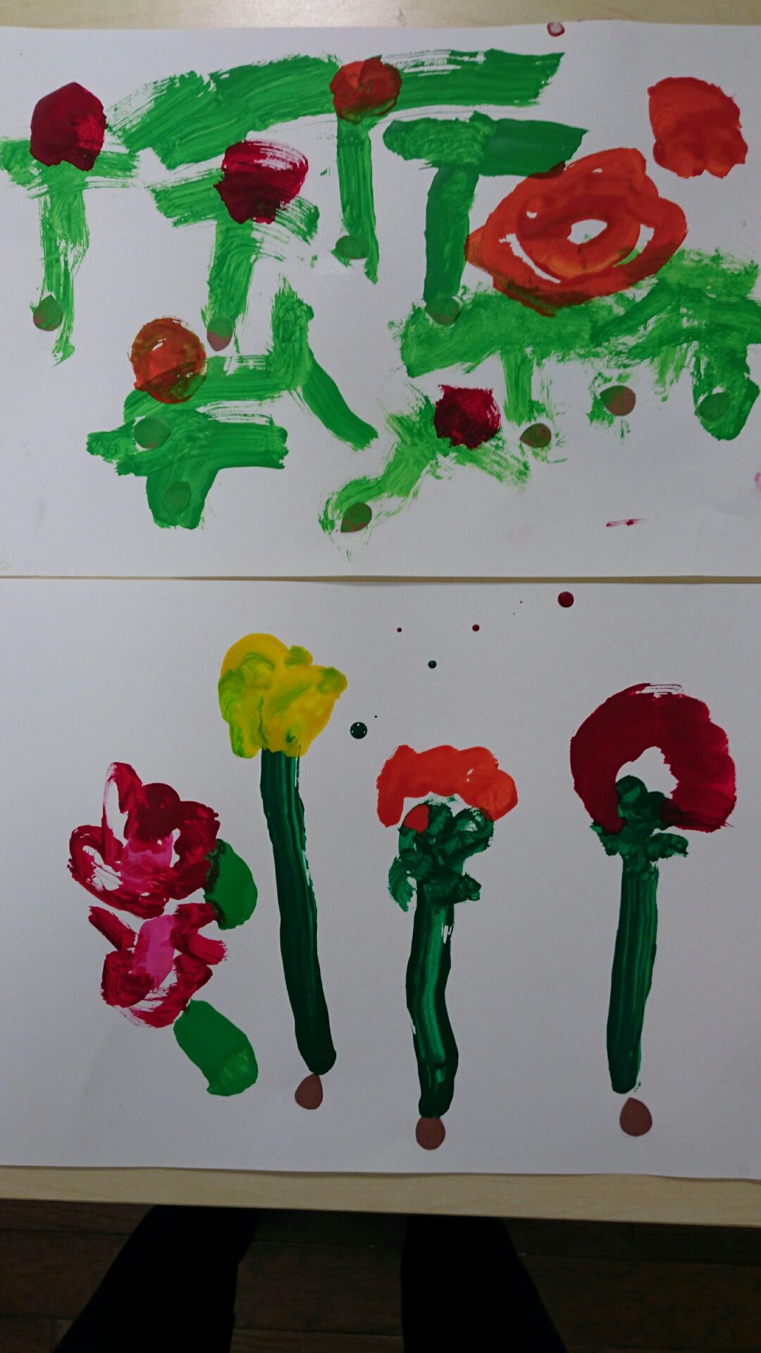 今日、ゆりさんでは画用紙に種を撒き(画用紙の種を糊付け)、絵の具で芽、葉、お花を描きました。