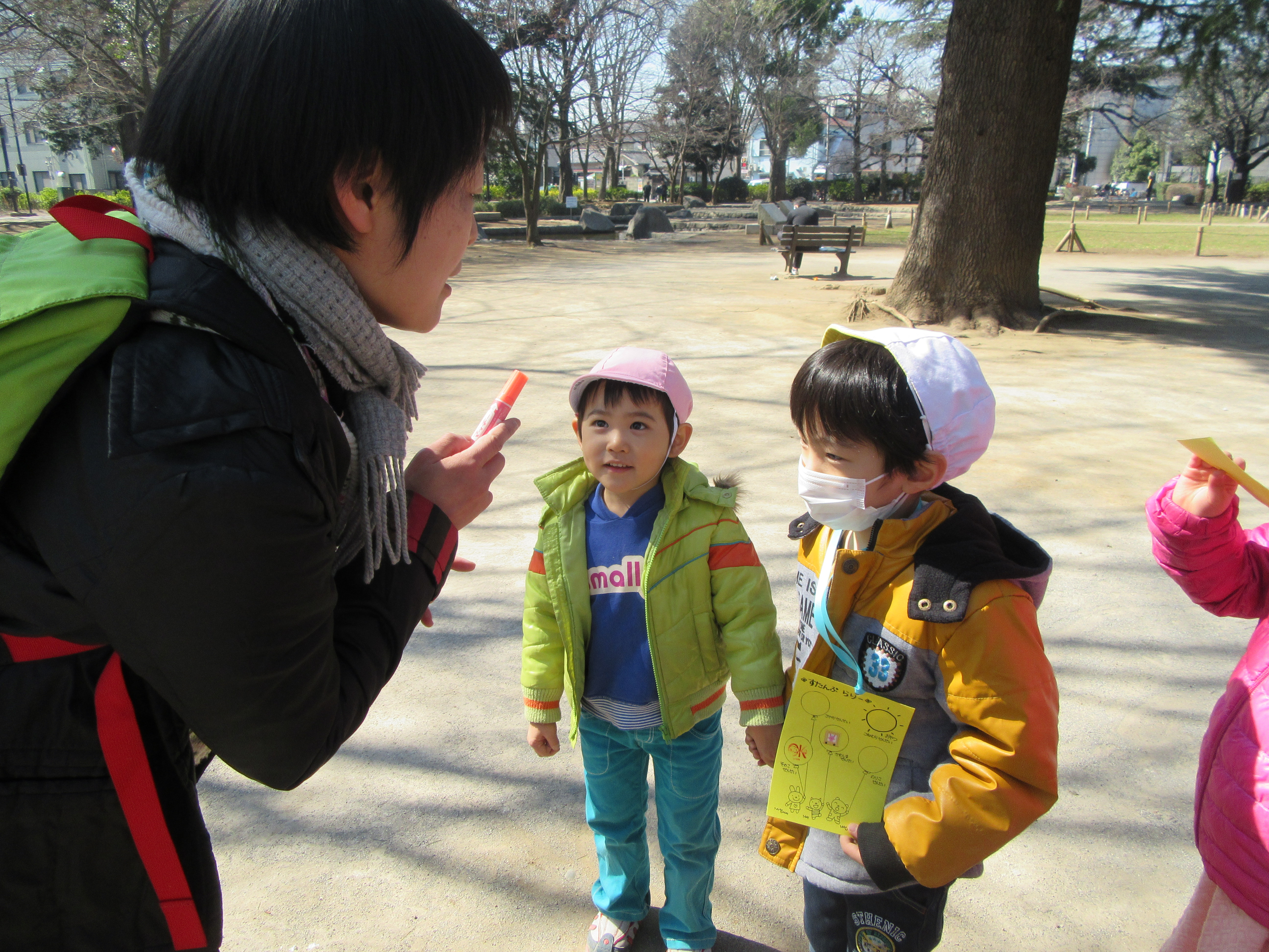 到着後、荷物を置いて公園を散策し“猛獣狩り”ゲームをして三人一組(長、中、少)になりスタンプラリーをしました。