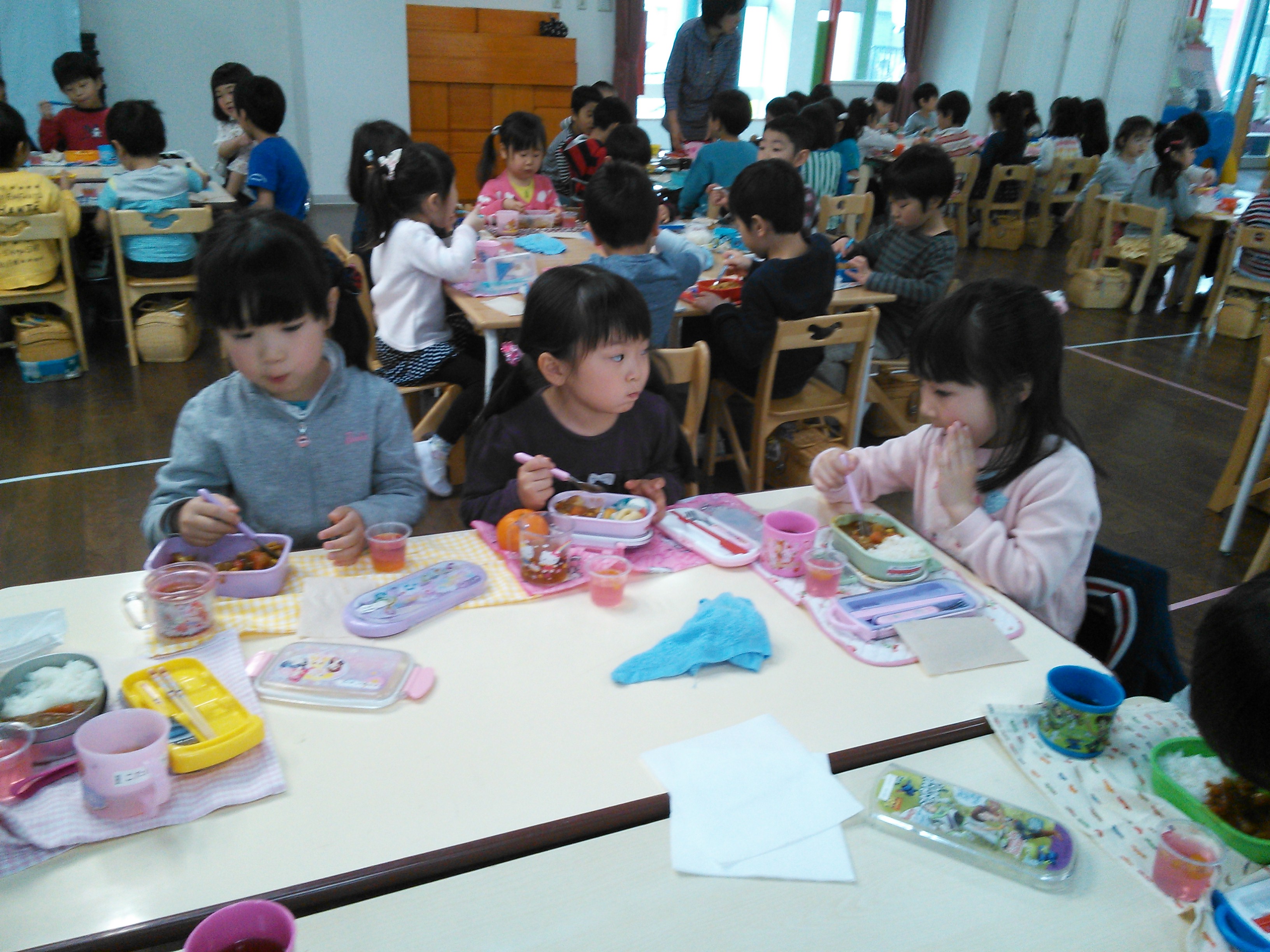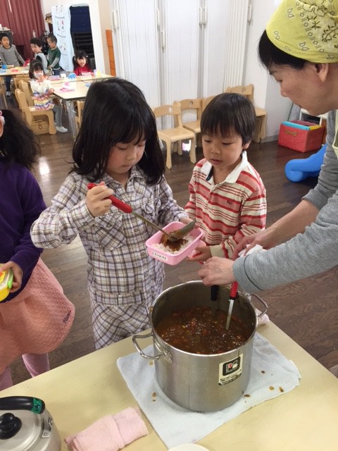 それぞれのお弁当箱にカレーを入れたり、お茶を注ぐのもその上手なこと!