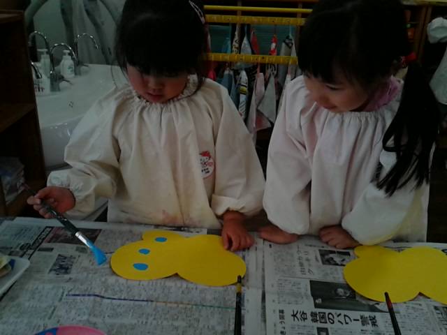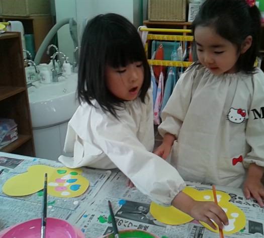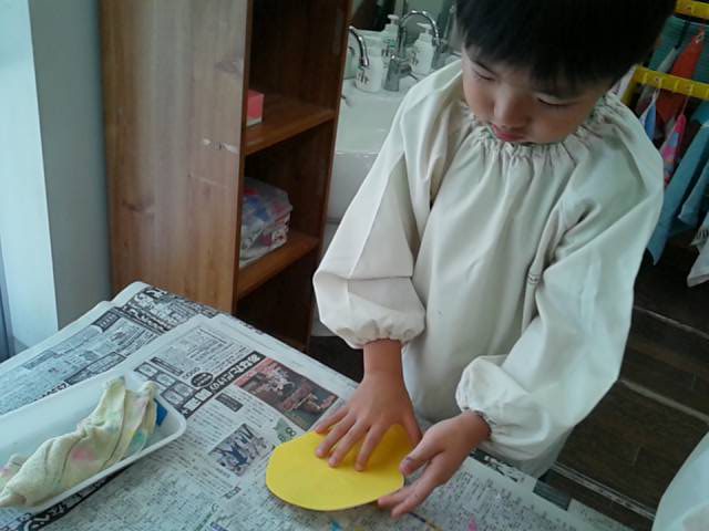 ちょうちょ型の黄色い画用紙に絵具をポタポタとつけて、半分に折ってごしごしこすって、パッと開くと…