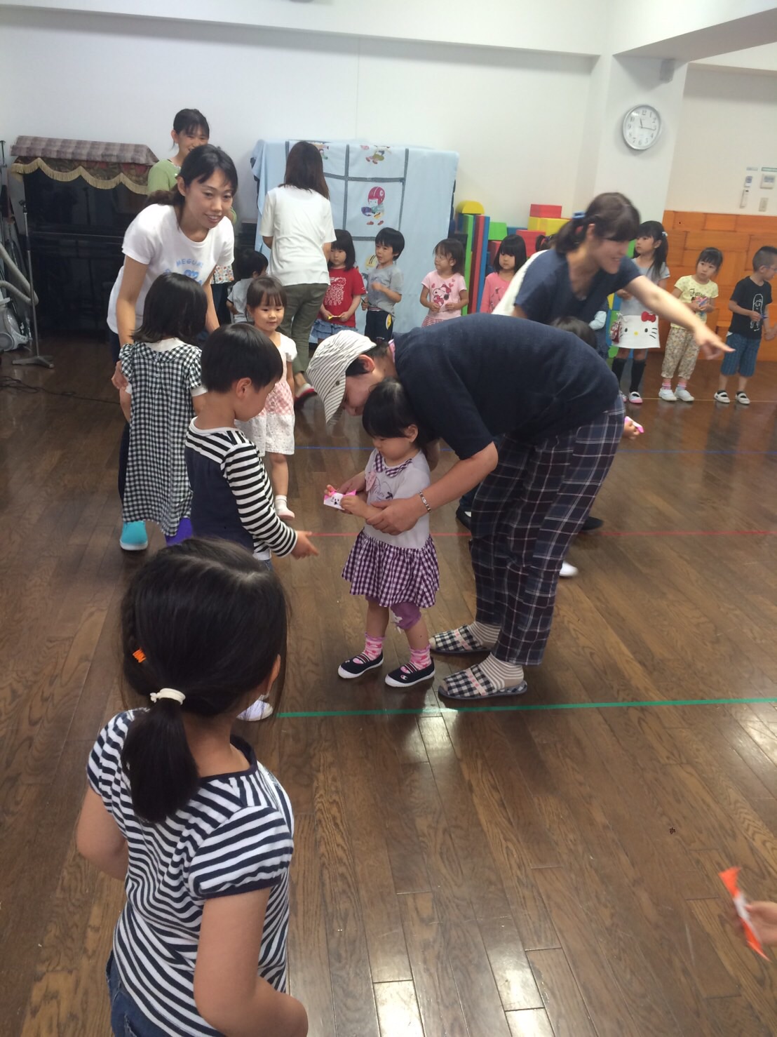 年中たんぽぽ組さんから、折り紙の指人形のプレゼント。とても可愛いプレゼントに、うれしそうなもも組さんでした。