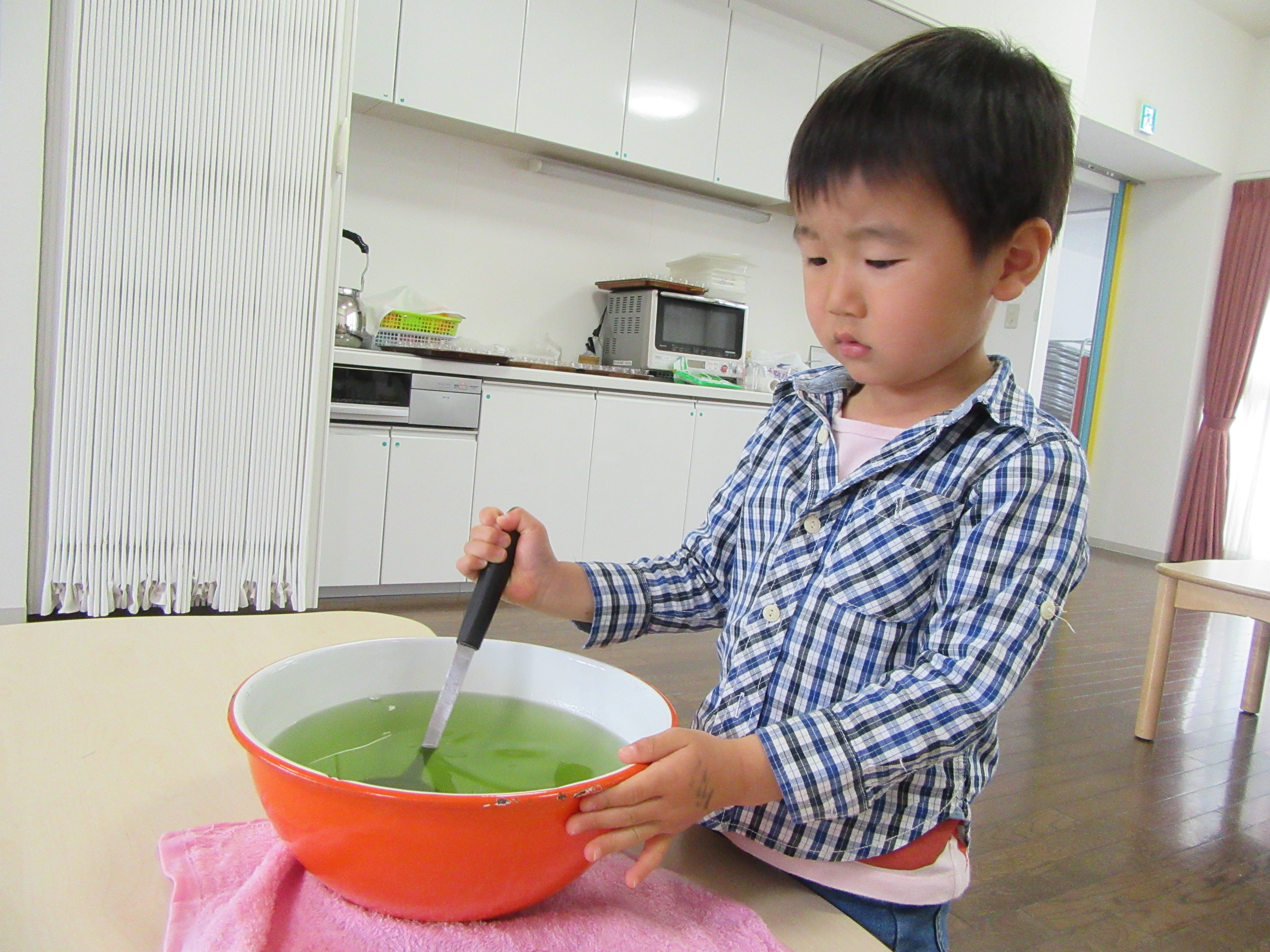 今日は、ゼリーを作りました。青リンゴ味のゼリーの袋を開けると「いい匂い」