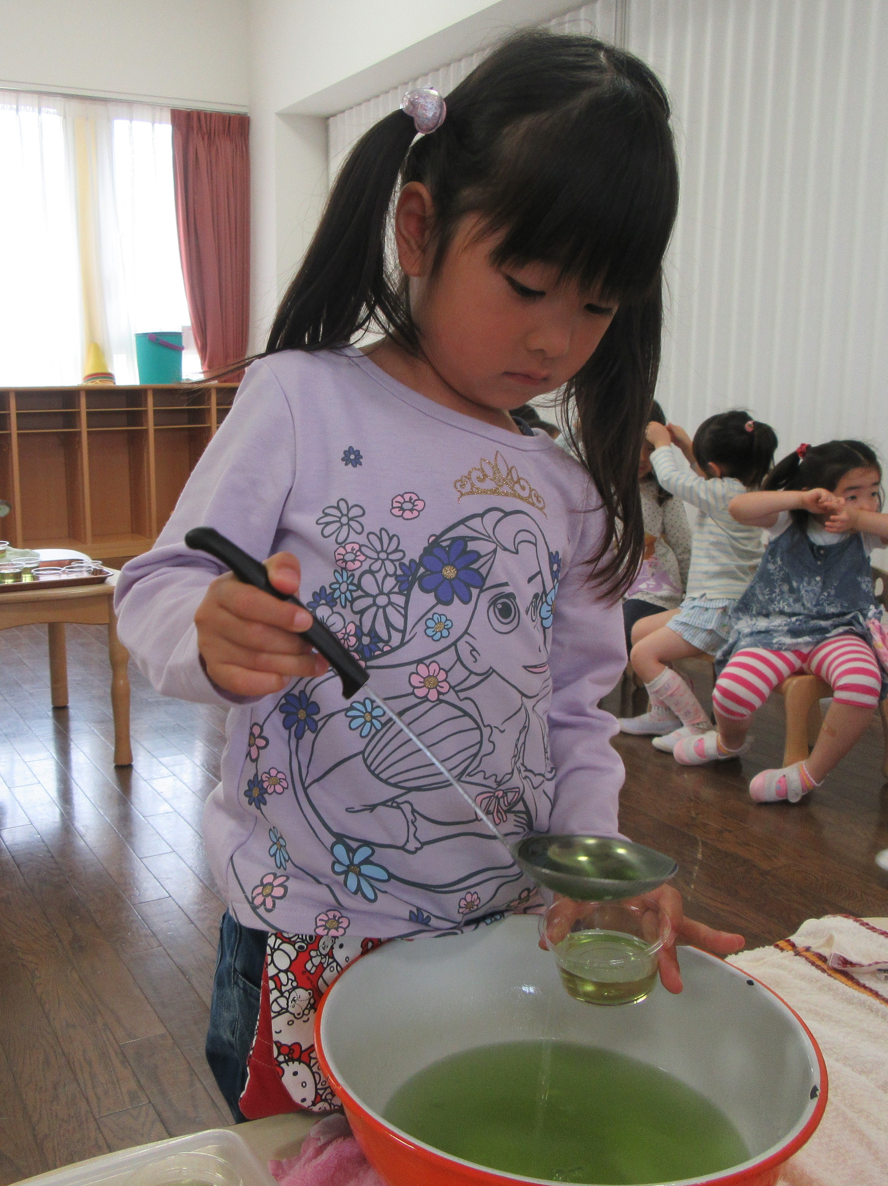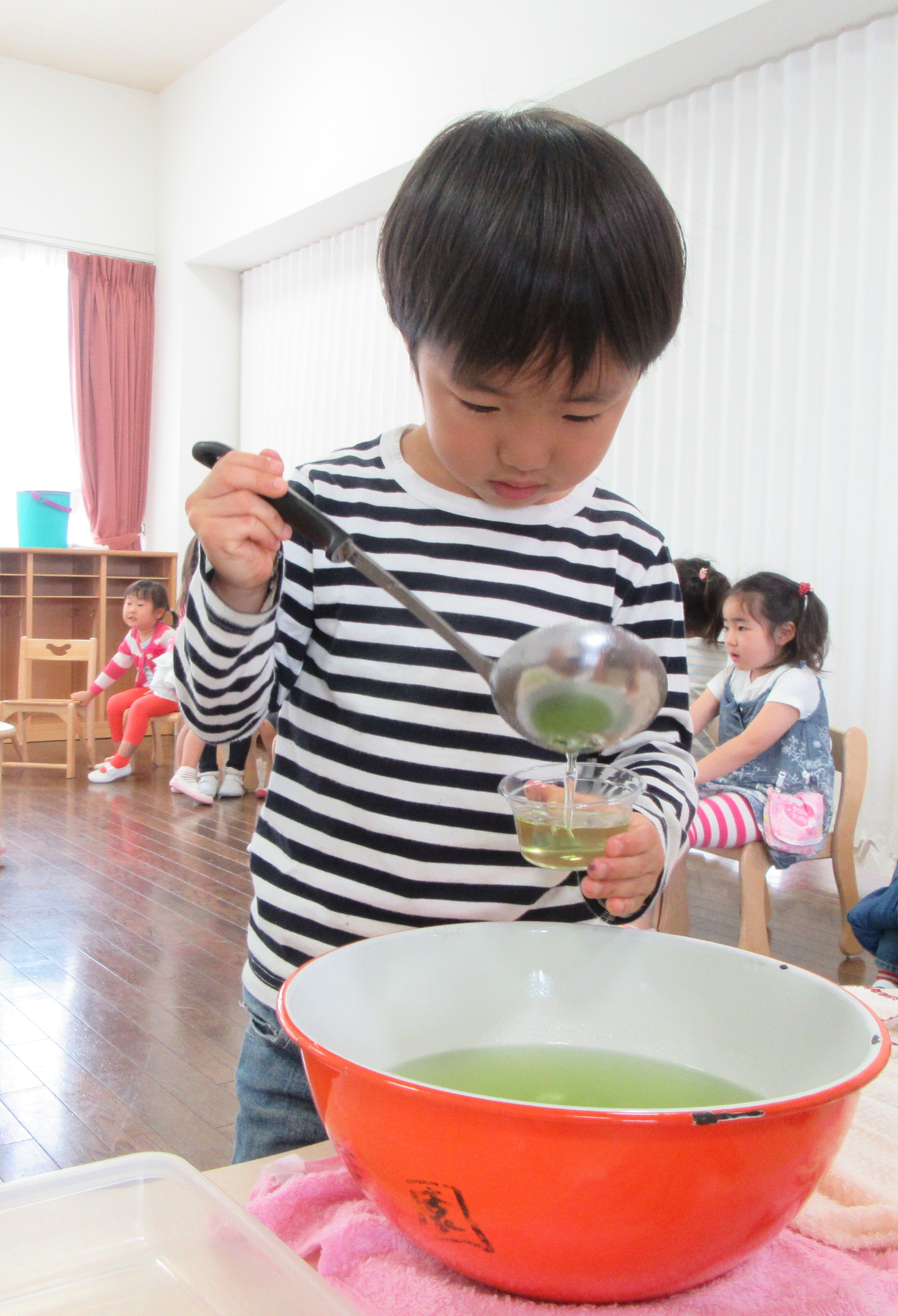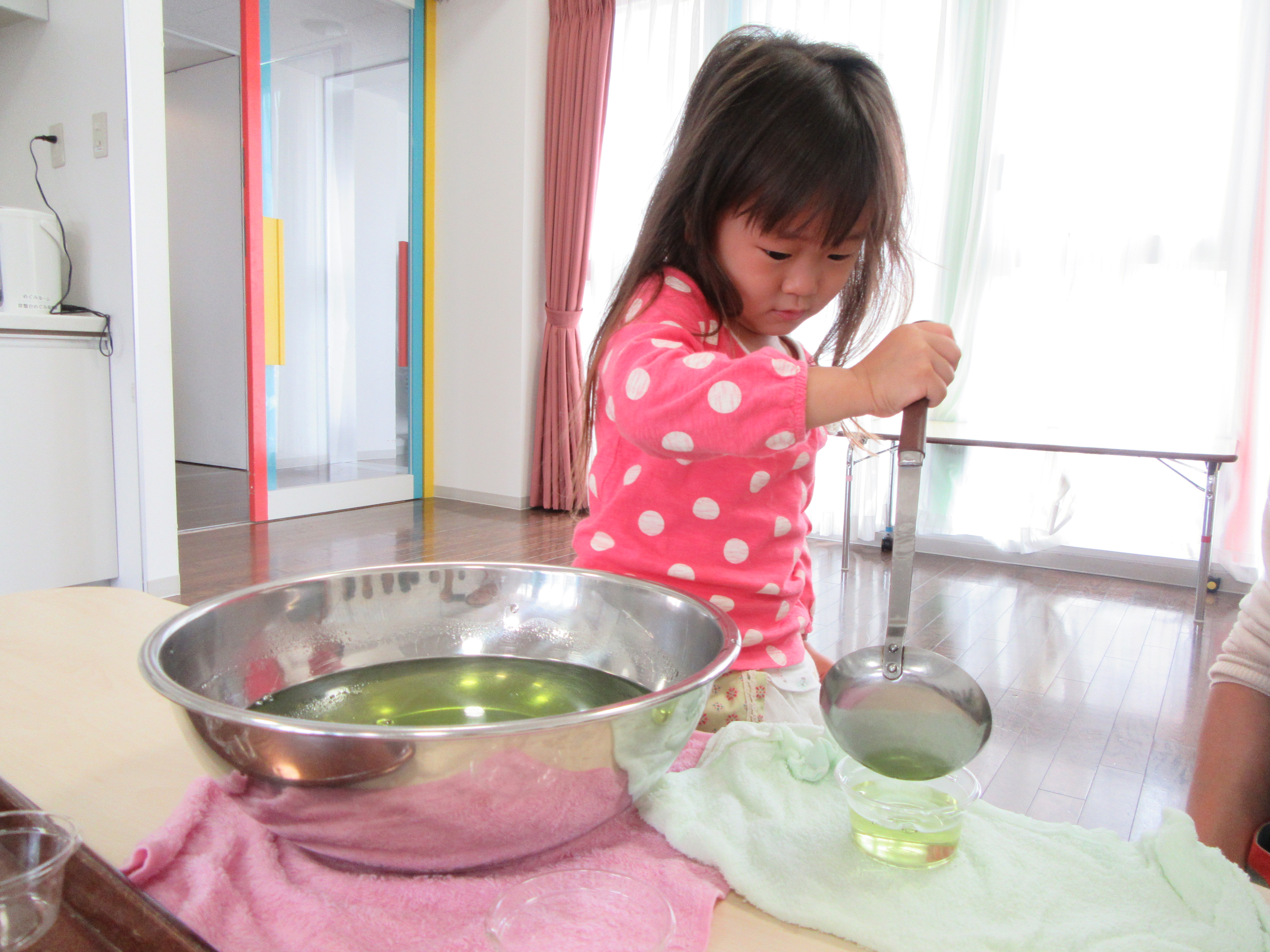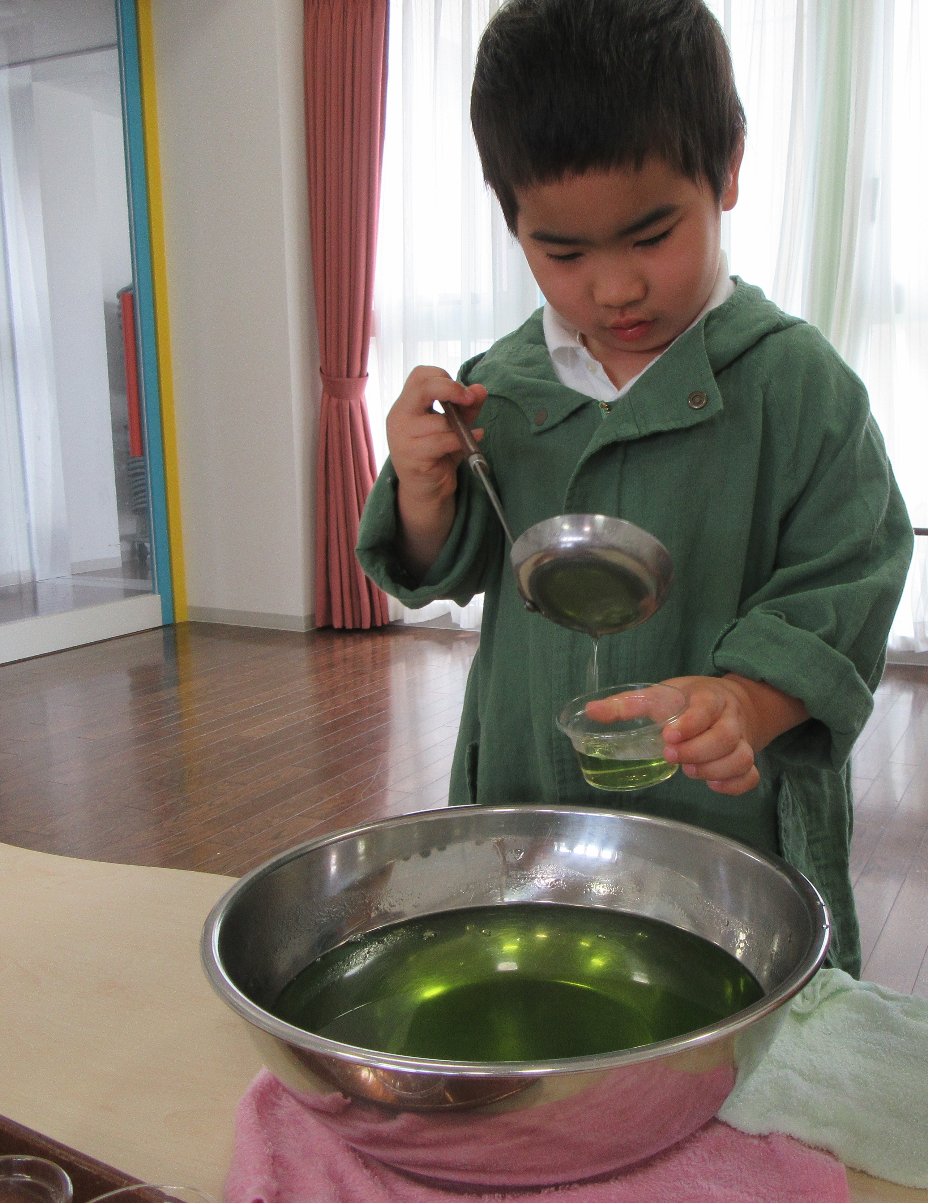 みんなで5回ずつかき混ぜます。その後、こぼさないように気をつけて…容器に取り分けます。見てください、この真剣な表情を。1人も溢さずに分けることができました。ホッとすると