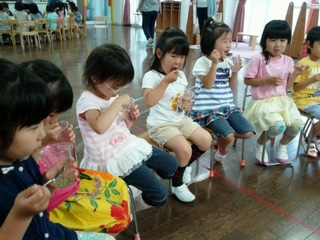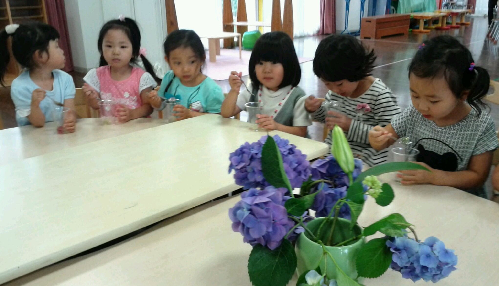今日は、ホールで、昨日作ったあじさい色のゼリーを元気に体操をした後に、皆でいただきました。