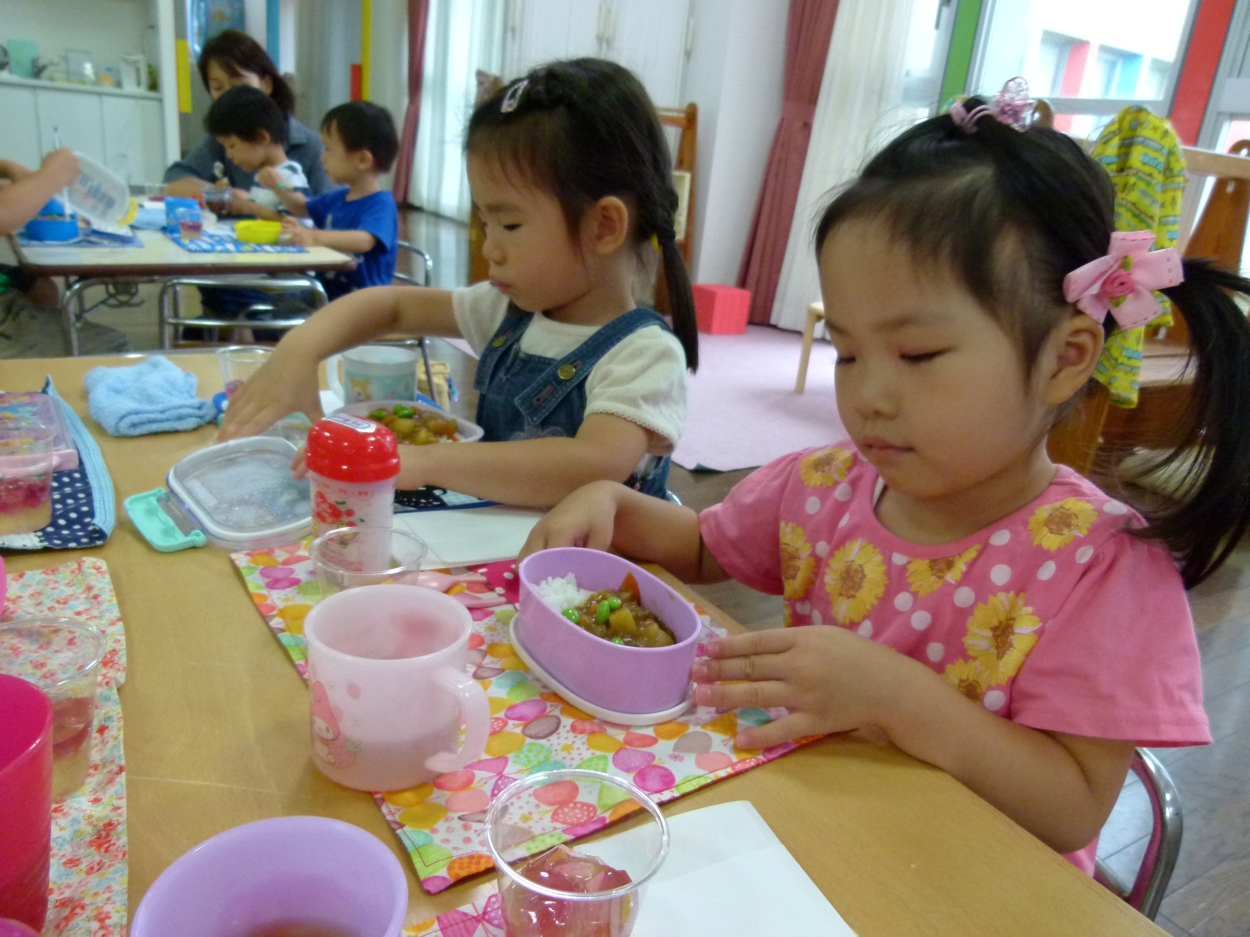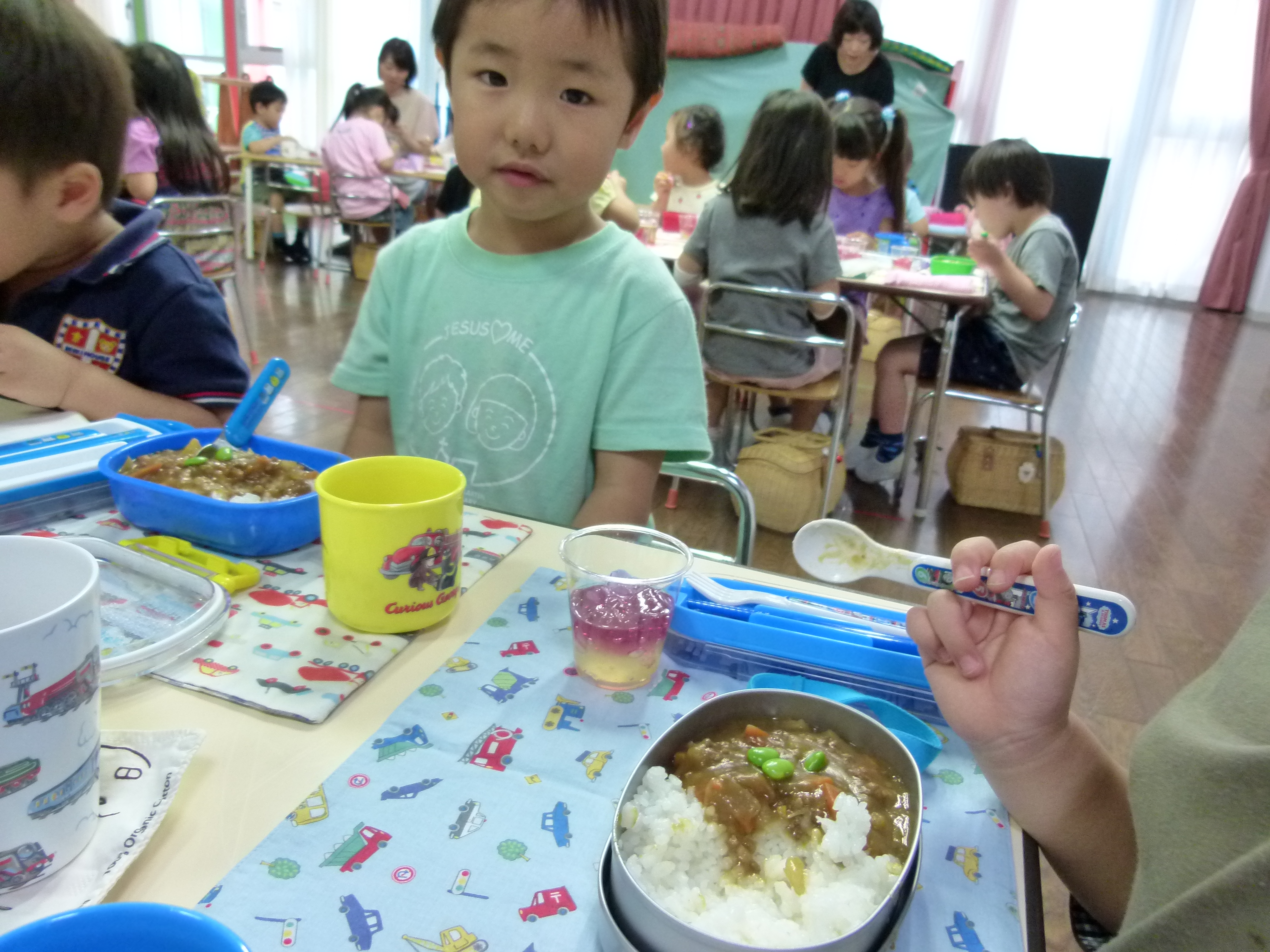 子どもたちは、お鼻をクンクン!「お腹がすいたねぇ」と会食の時間待ち遠しい様子です。今日のカレーは、幼稚園のお庭で育てたミニトマト入りです。そしてお弁当箱の蓋を開けるとカレーライスの上には、幼稚園で育てた枝豆がトッピングされていました!