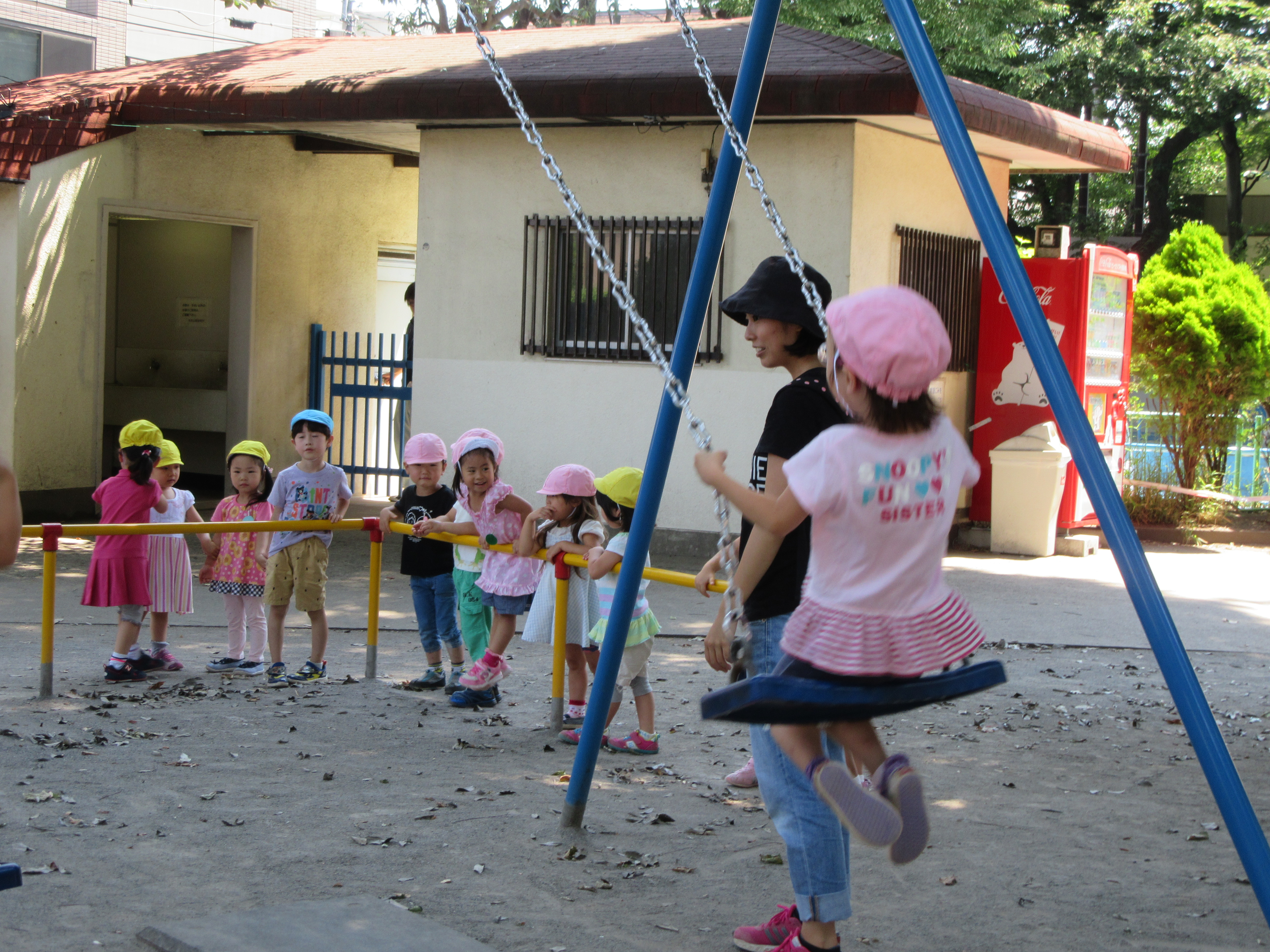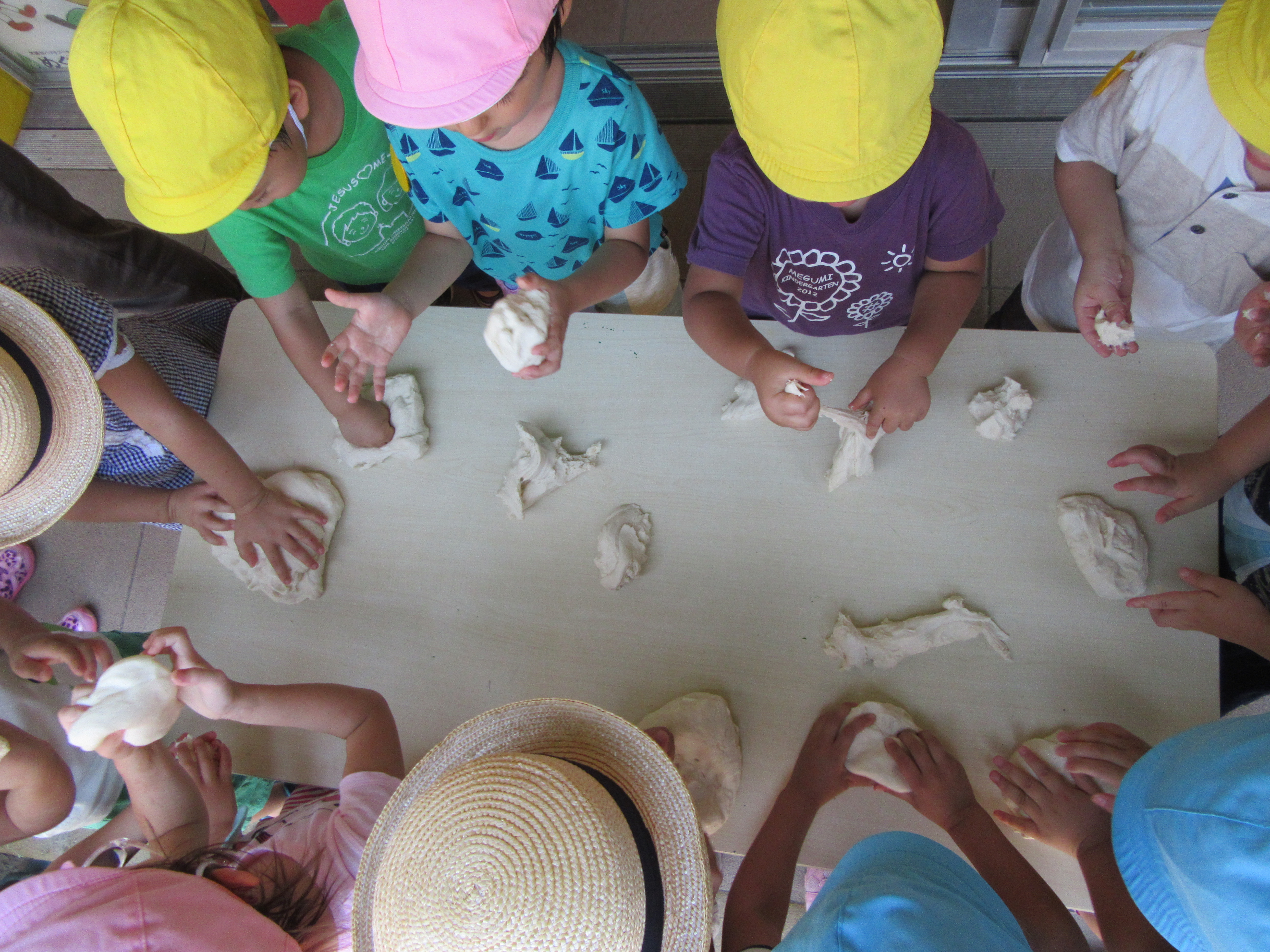 手を繋いで 、みずくぼ公園までお散歩して一緒に遊びました。幼稚園にもどってから小麦粉粘土、シャボン玉を楽しんだあとは、グループごとにパイナップルを頂きました。「冷たいね!」「美味しいね!」