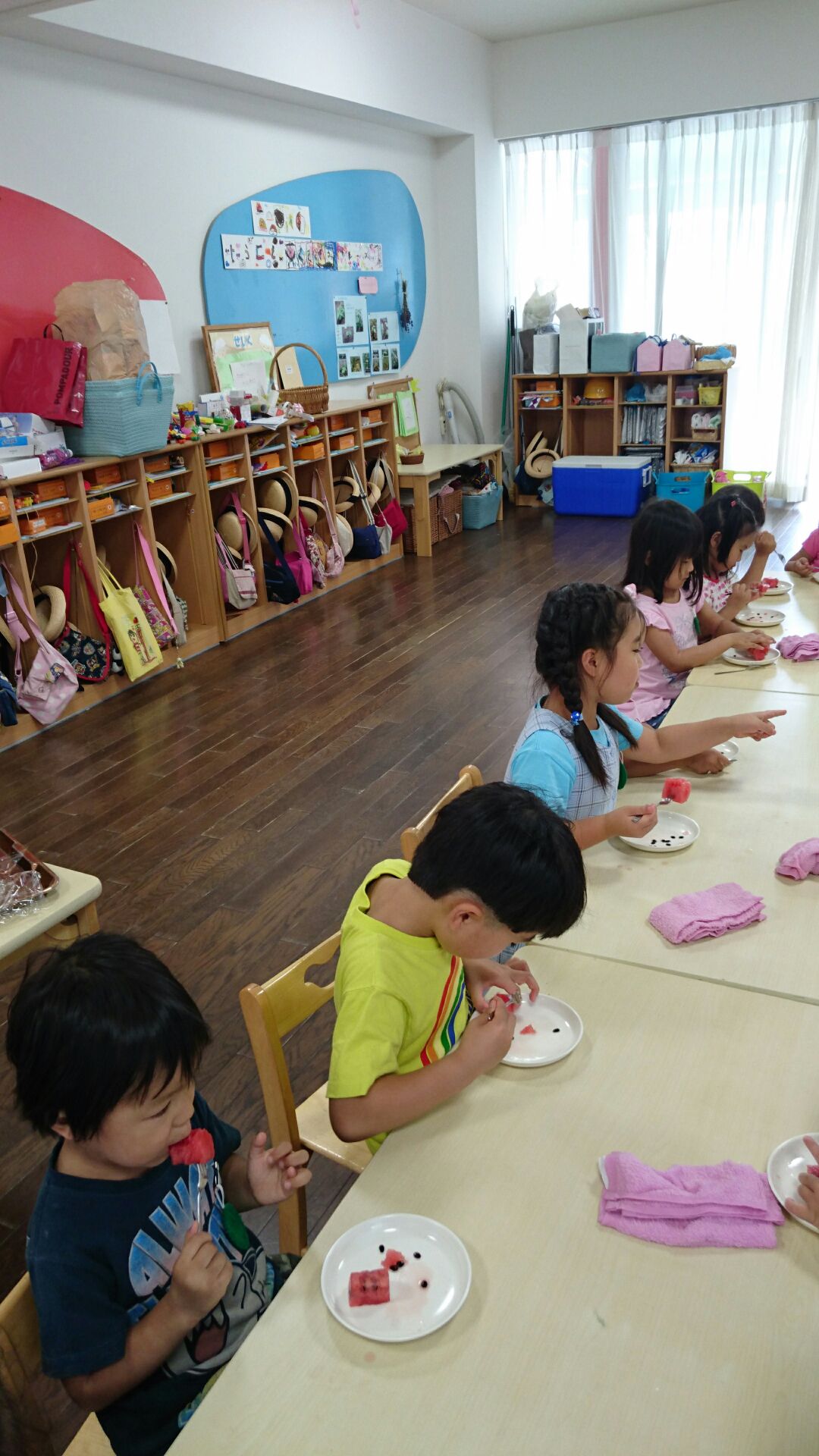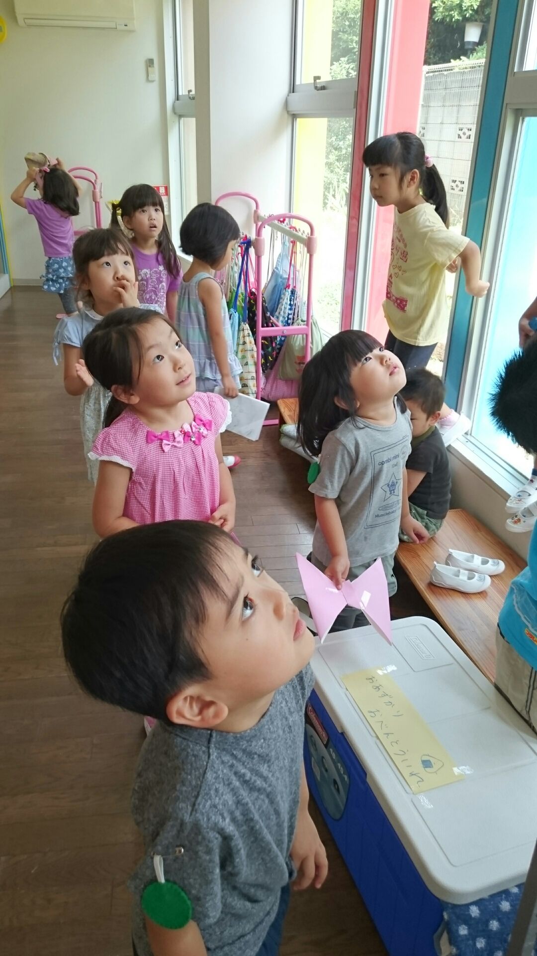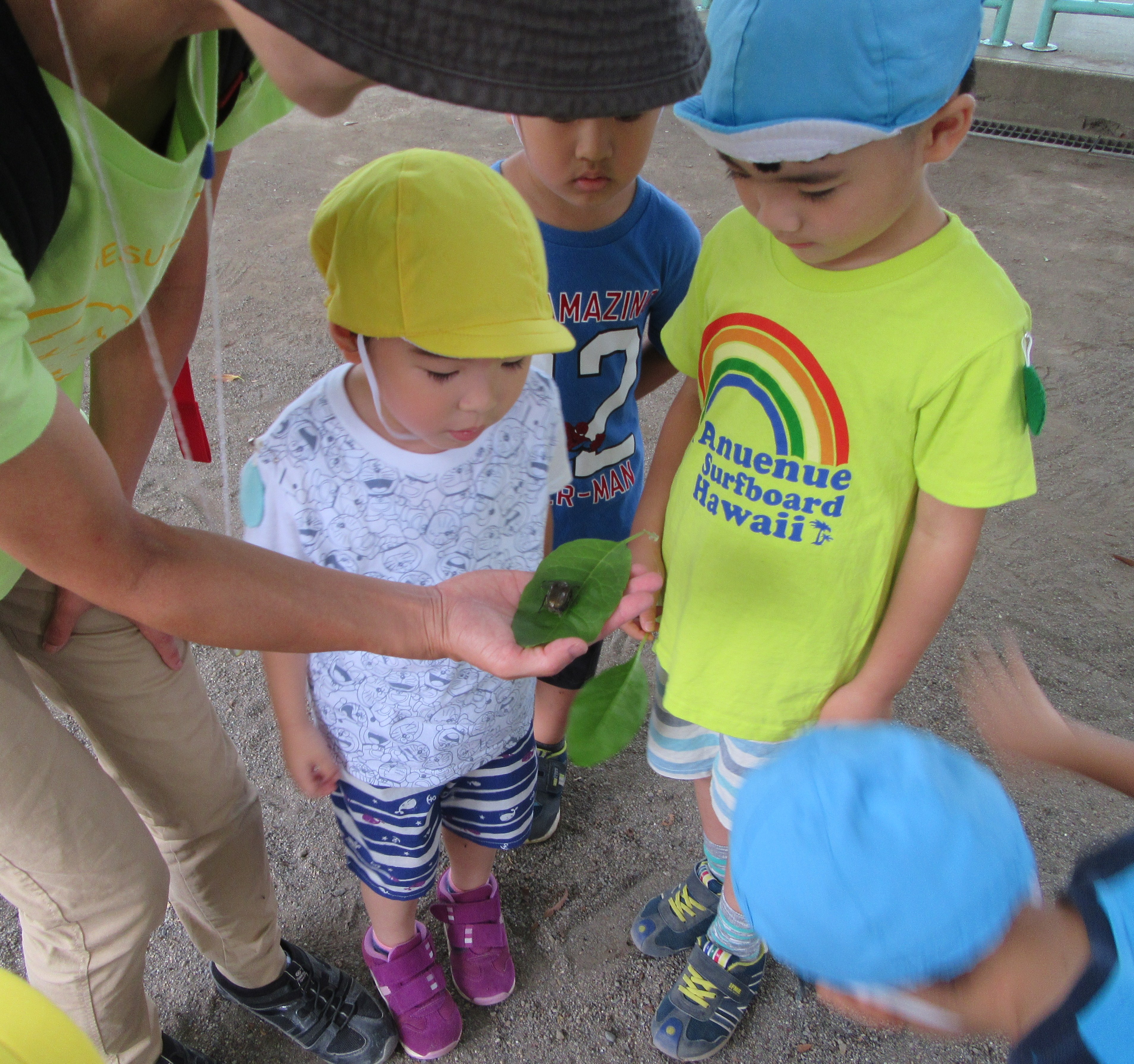 『グループ交流日Ⅱ』 今日のひとこま 2016.07.12 今日もグループに分かれ、礼拝の後水久保公園へお散歩に行きました。 昨日より手を繋いで歩くのも上手になりました。 2学期はもっと仲良くなりたいですね。 園庭からお部屋に飛び込んで来たお客様に大喜び。もっと一緒に居たかったけど、広いお空に帰って行くのを見送りました。 公園で見つけたカナブン。 小さいお友だちが「見せて」「わー、動いてる!」 今日のおやつはスイカ。 暑い日には格別に美味しい! おかわりをして食べました。