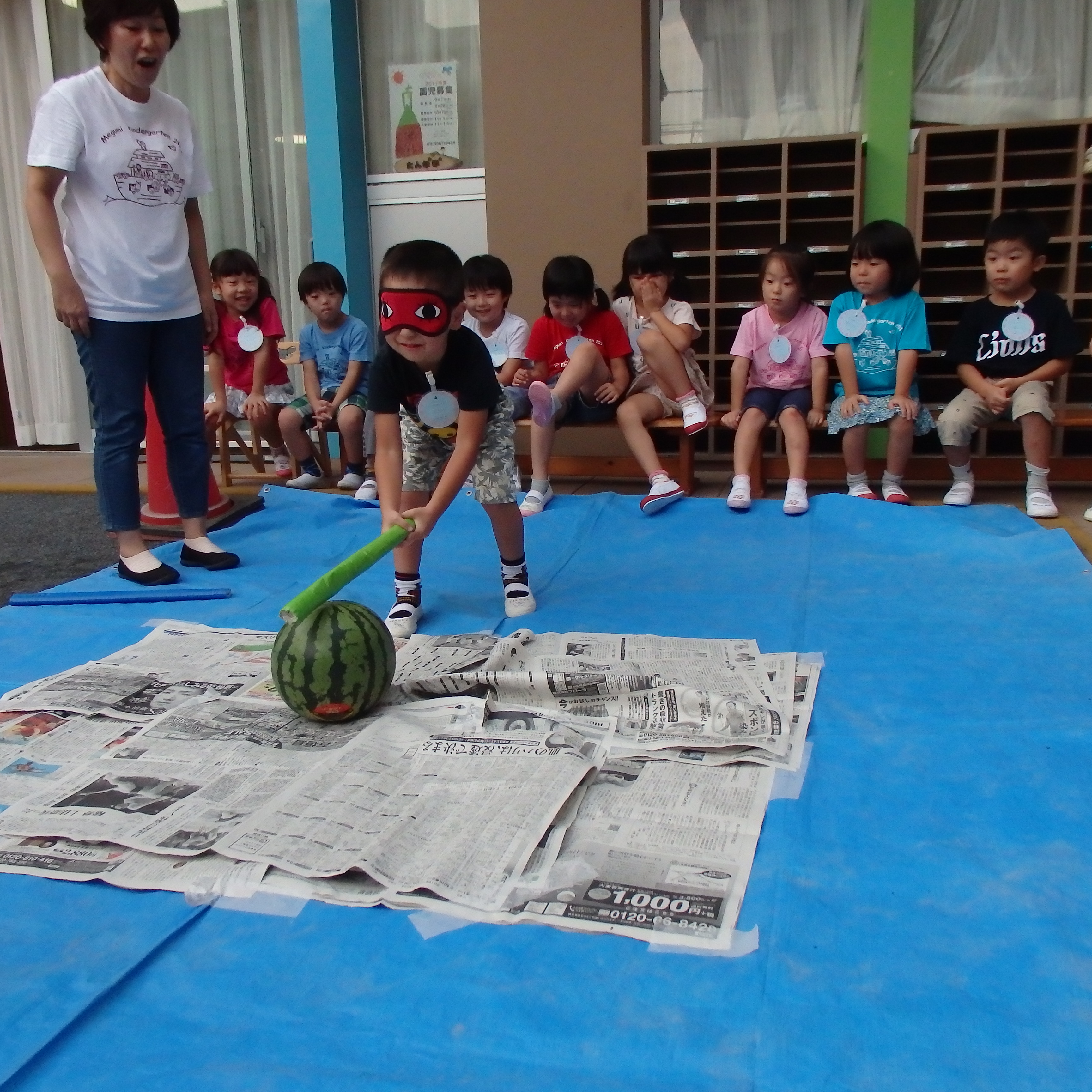 スイカ割り。今日はビーチボールではなく本物のスイカです。さくら組22人で力強を合わせ、見事に割りました!