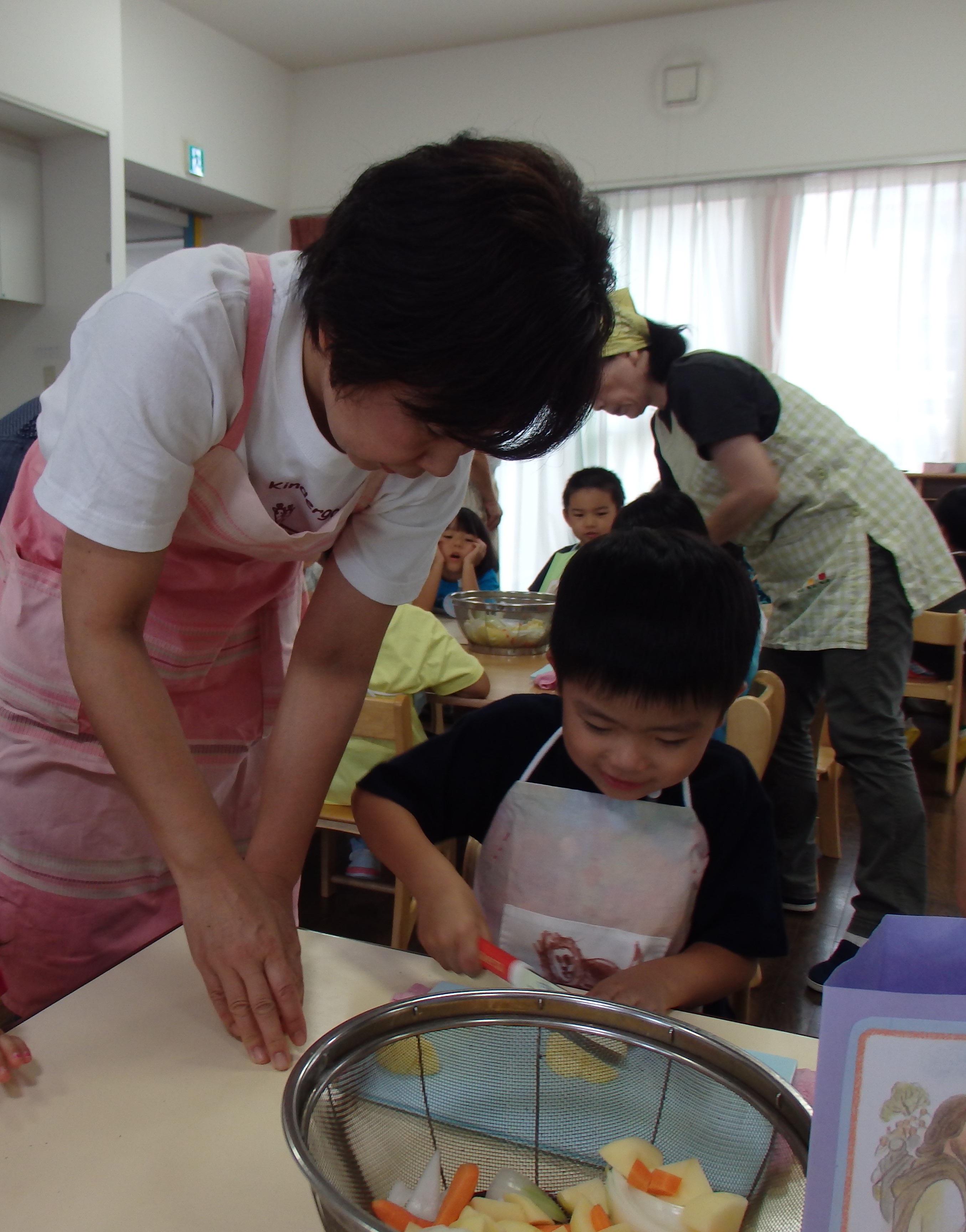 カレー作りもしました。人参、じゃがいも、玉ねぎを包丁で切りました。年少さんからやっているので、慣れた手つきです。美味しいカレーが出来ました。