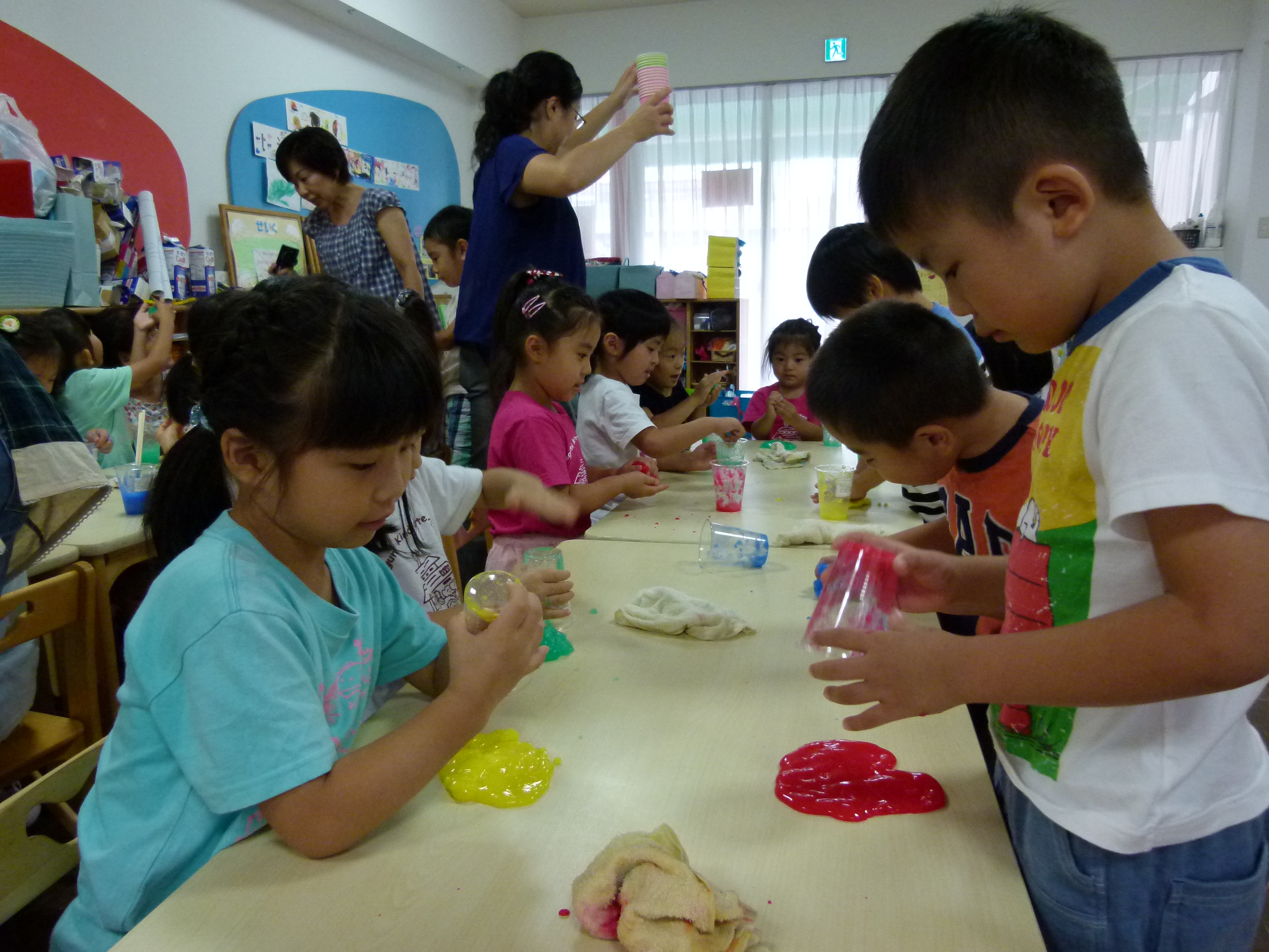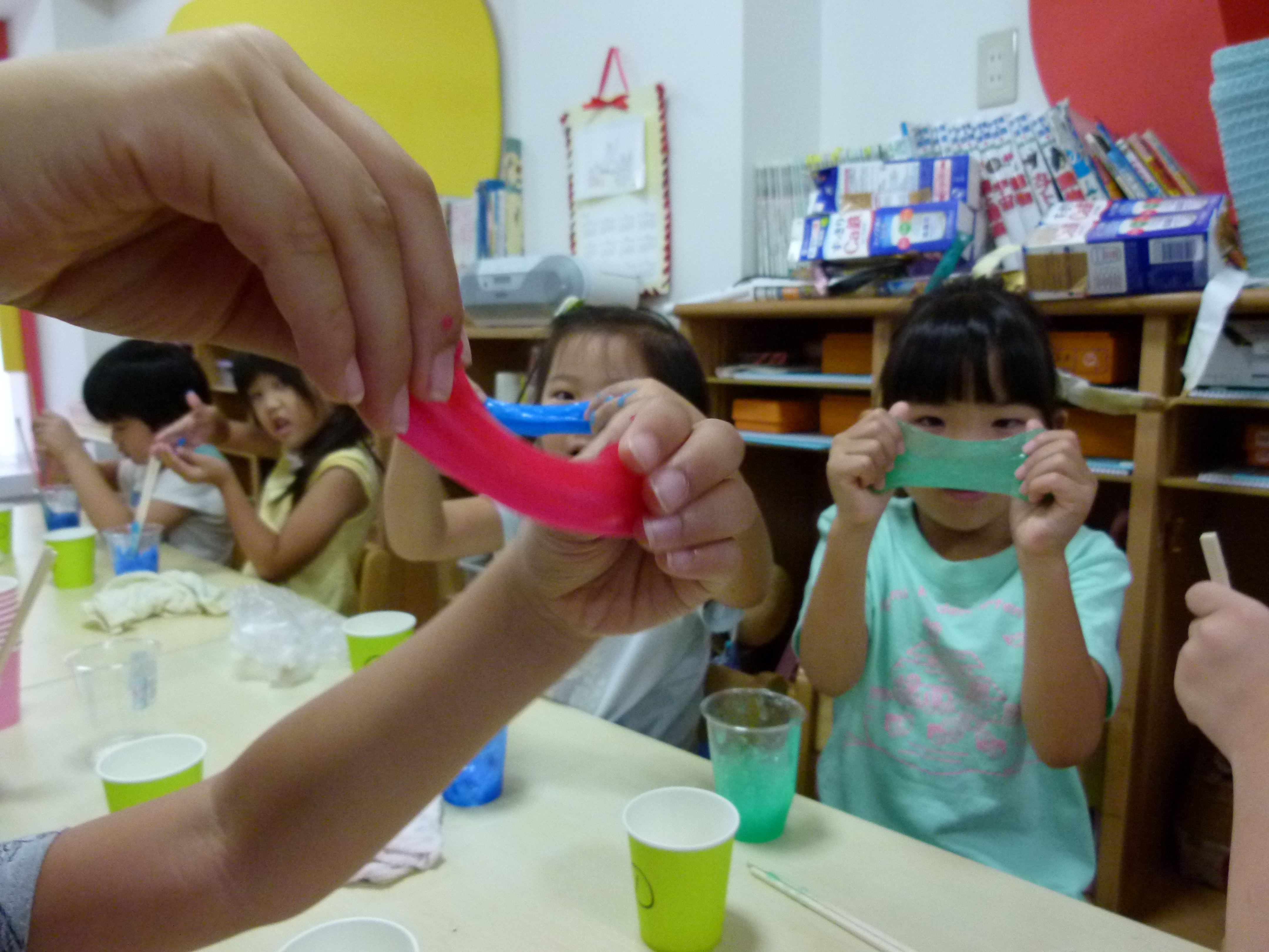 色水と洗濯のりにホウ砂水を加えたらプルンプルンとなり、驚きの声が上がりました。「気持ちいい~」手に持って感触を楽しみ、お土産としてお家へ持ち帰りました。