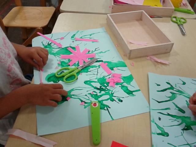 葉の細長いところはストローで絵の具を吹いて表しました。