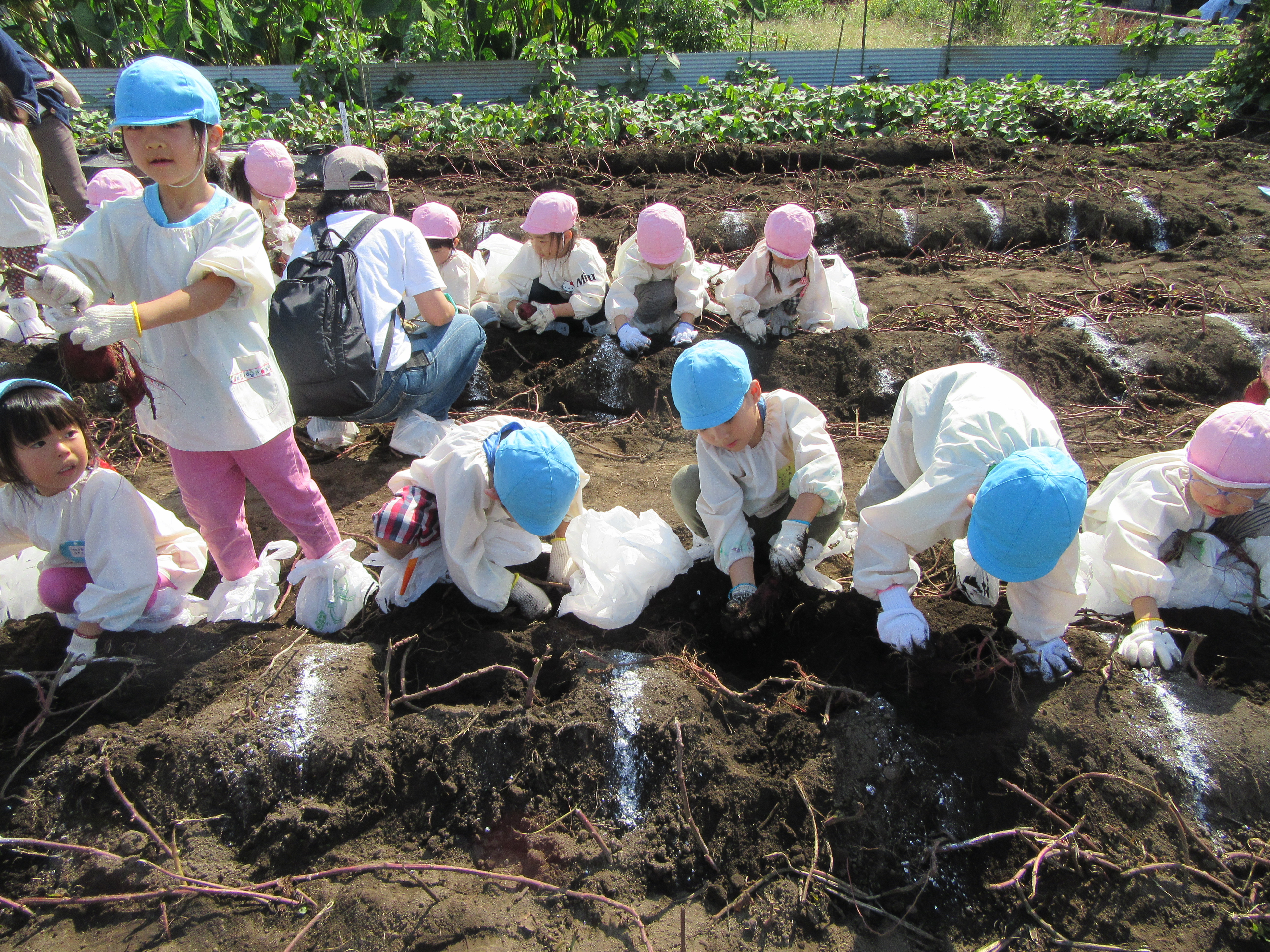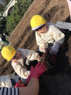 年中・年長組は、『お芋掘り』の経験がありますが…土の中からのお芋とのご対面は、それはそれはしワクワク、嬉しいものです。