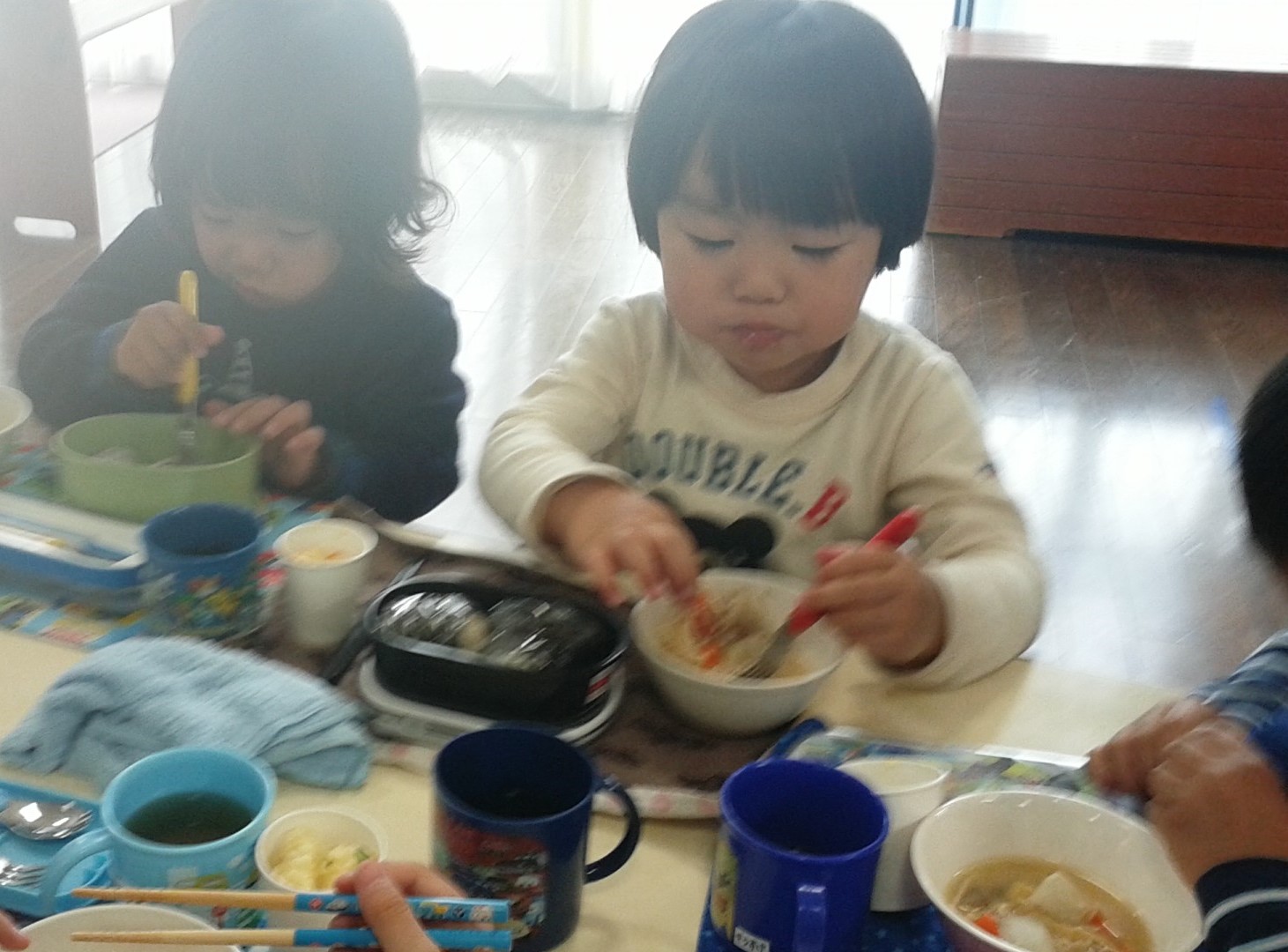 お昼はホールに3クラスが集まってランチパーティーをしました。