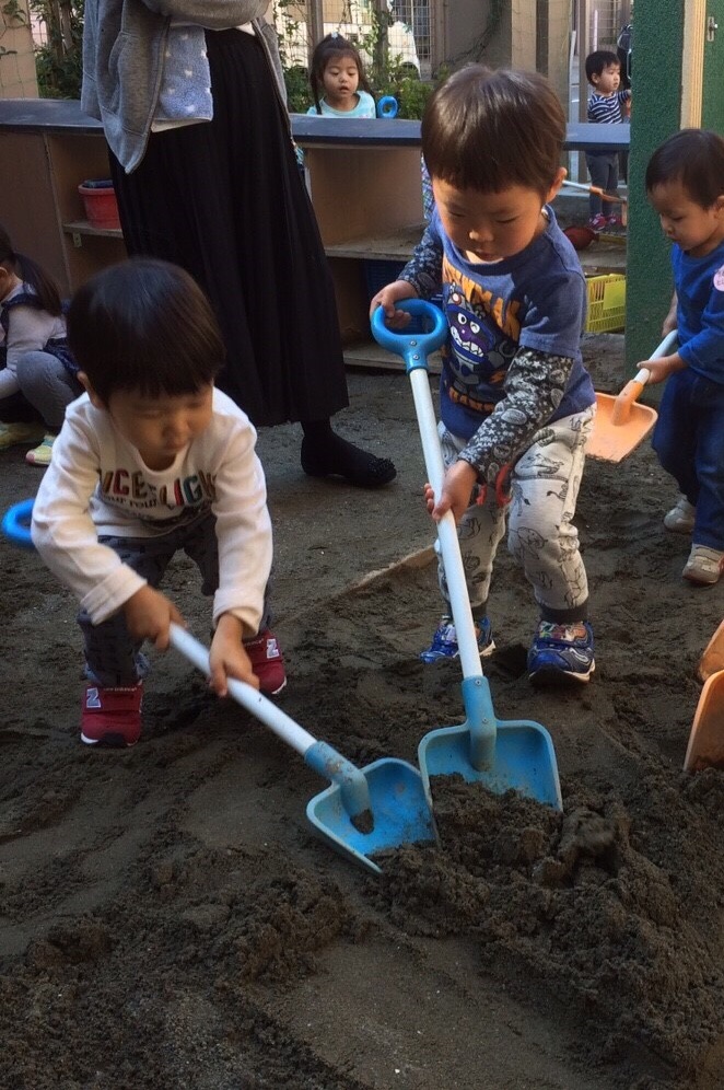 いいお天気でしたので、みんなで外遊びをしました。砂場で工事ごっこ。お山を作ったり、ケーキを作ったり、楽しく遊びました。